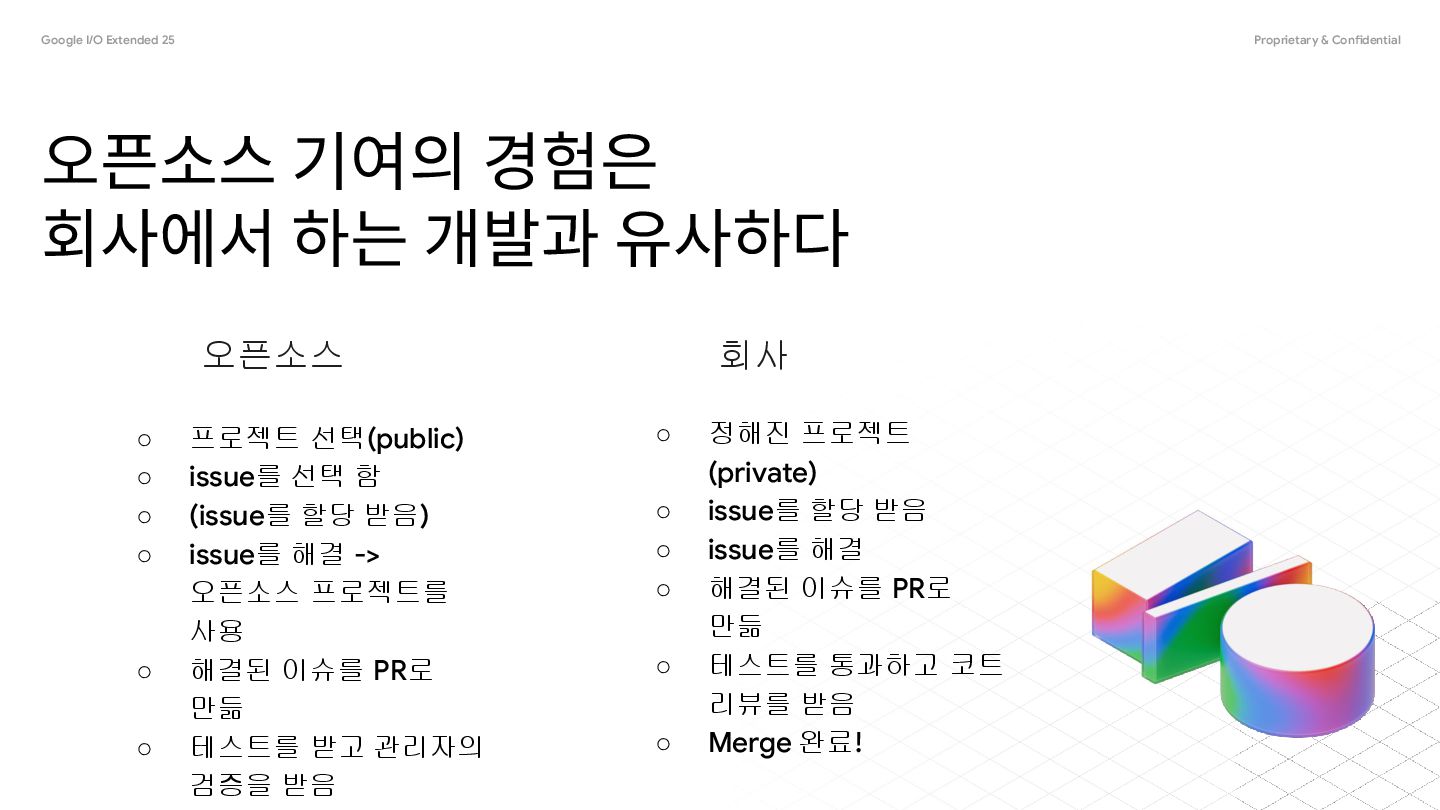 회사에서 하는 개발과 유사하다 ◦ 프로젝트 선택(public) ◦ issue를 선택 함 ◦ (issue를 할당 받음) ◦ issue를 해결 -> 오픈소스 프로젝트를 사용 ◦ 해결된 이슈를 PR로 만듦 ◦ 테스트를 받고 관리자의 검증을 받음 ◦ 정해진 프로젝트 (private) ◦ issue를 할당 받음 ◦ issue를 해결 ◦ 해결된 이슈를 PR로 만듦 ◦ 테스트를 통과하고 코트 리뷰를 받음 ◦ Merge 완료! 오픈소스 회사