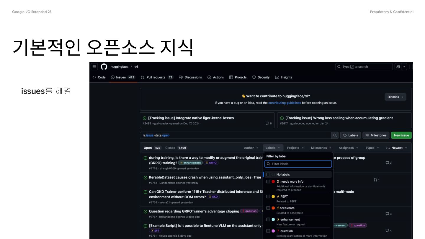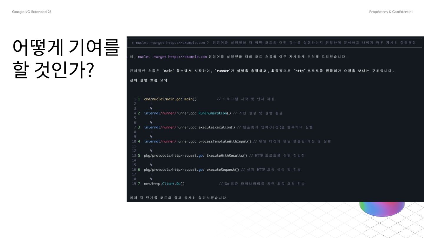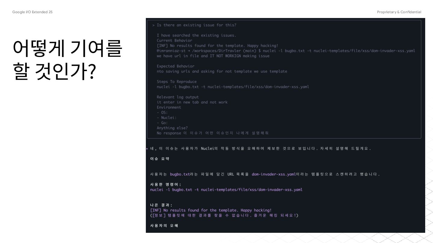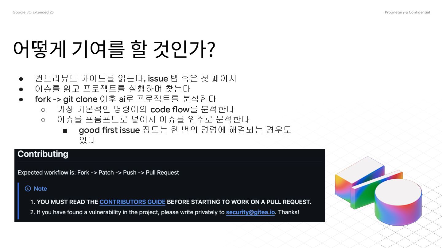것인가? • 컨트리뷰트 가이드를 읽는다, issue 탭 혹은 첫 페이지 • 이슈를 읽고 프로젝트를 실행하며 찾는다 • fork -> git clone 이후 ai로 프로젝트를 분석한다 ◦ 가장 기본적인 명령어의 code flow를 분석한다 ◦ 이슈를 프롬프트로 넣어서 이슈를 위주로 분석한다 ▪ good first issue 정도는 한 번의 명령에 해결되는 경우도 있다
