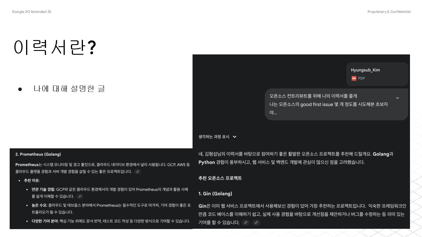 하면 좋다는 이야기는 익히 들었지만 그걸 어떻게 시작해야하는지, 특히 학생 및 주니어 개발자의 기준에서 시작하기는 쉽지 않습니다 본 발표는 생성형 AI를 활용해서 하루만에 오픈소스 기여를 해본 방법을 소개하고자 합니다 이를 통해 누구나 쉽게 시도할 수 있는 방법을 알리고자 합니다 개요