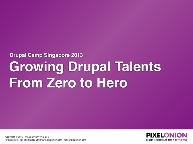 Tel: +65 8 2233 956 | www.pixelonion.com | [email protected] SECRET INGREDIENTS FOR A BETTER WEB Growing Drupal Talents From Zero to Hero Drupal Camp Singapore 2013