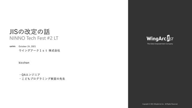 ウイングアーク1st 株式会社 kicchan ・QAエンジニア ・こどもプログラミング教室の先生 October 24, 2021 JISの改定の話 NINNO Tech Fest #2 LT