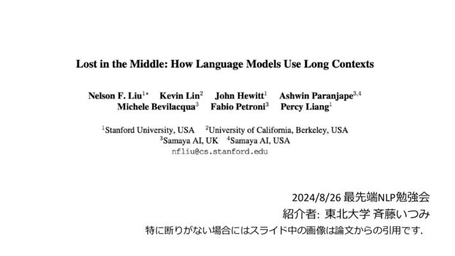 2,000,000 Claude 3 200,000 InternLM 2.5 1,000,000 Yi 200k 200,000 Llama 3.1 128,000 Phi3 128k 128,000 Deepseek-V2 128,000 • オープンなモデルでも,100K〜1Mの入力長を扱えるようになってきた • 長い文章をそのままモデルに入力できるように. • 一方で,長い入力に対してモデルがどのように振る舞うのかの検証は少ない • (注)下記は全て2024年以降のモデル.論文発表時点では16,000token程度が主流