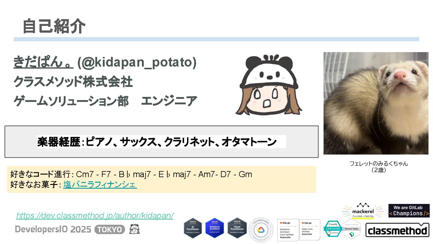 自己紹介 https://dev.classmethod.jp/author/kidapan/ きだぱん。 (@kidapan_potato) クラスメソッド株式会社 ゲームソリューション部 エンジニア フェレットのみるくちゃん (2歳) 楽器経歴:ピアノ、サックス、クラリネット、オタマトーン
