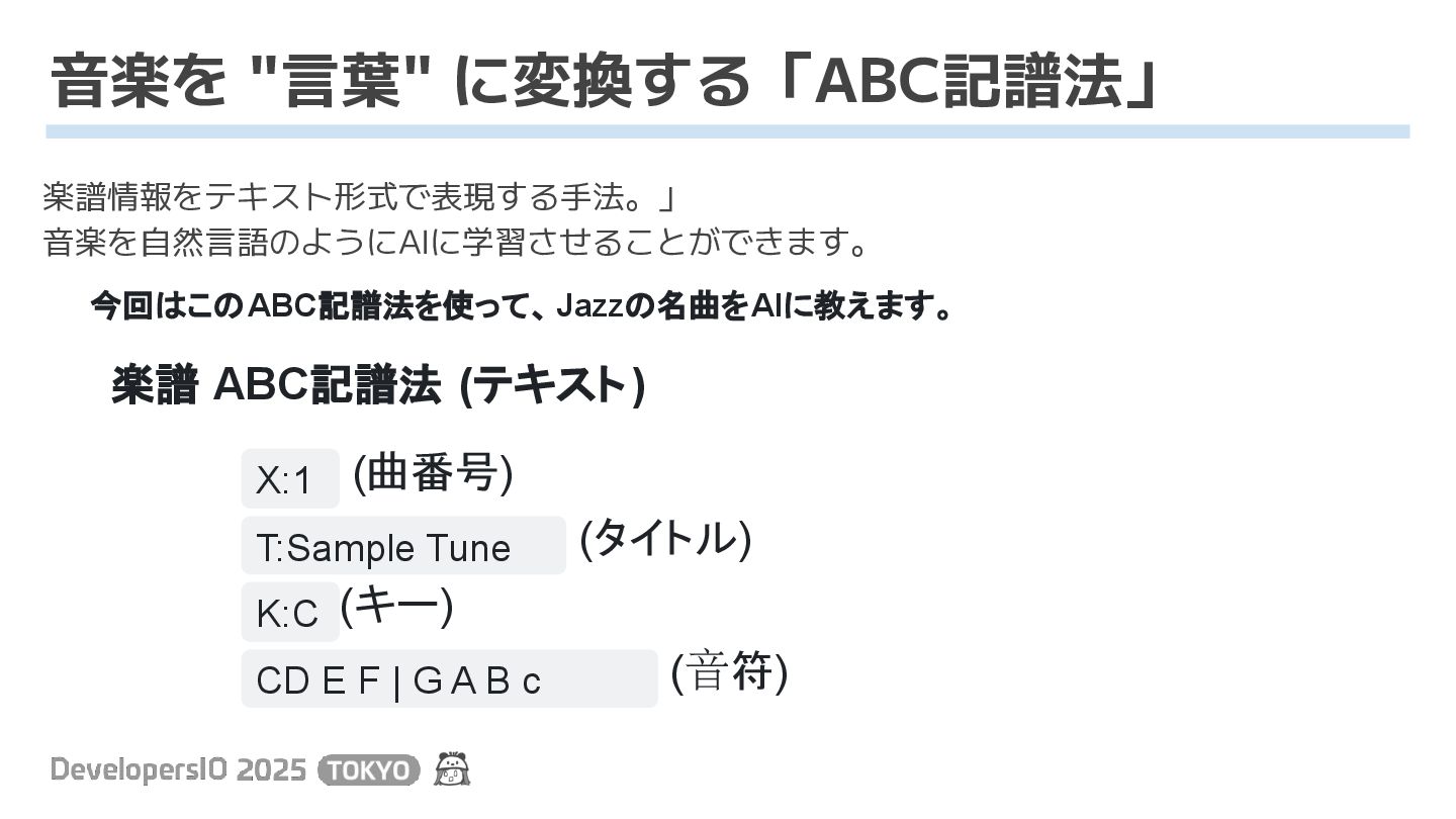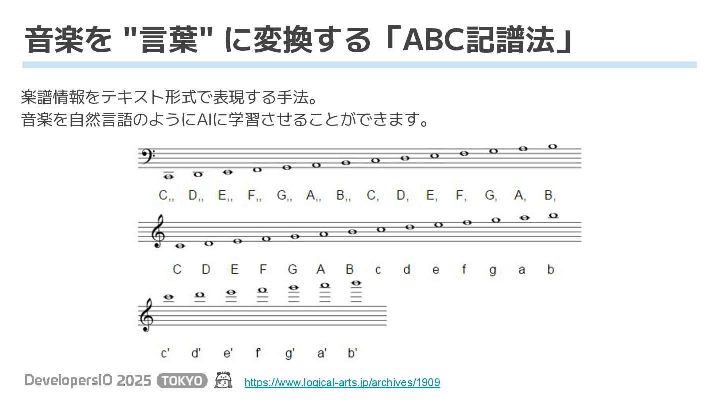 ⾳楽を "⾔葉" に変換する「ABC記譜法」 楽譜情報をテキスト形式で表現する⼿法。 ⾳楽を⾃然⾔語のようにAIに学習させることができます。 https://www.logical-arts.jp/archives/1909