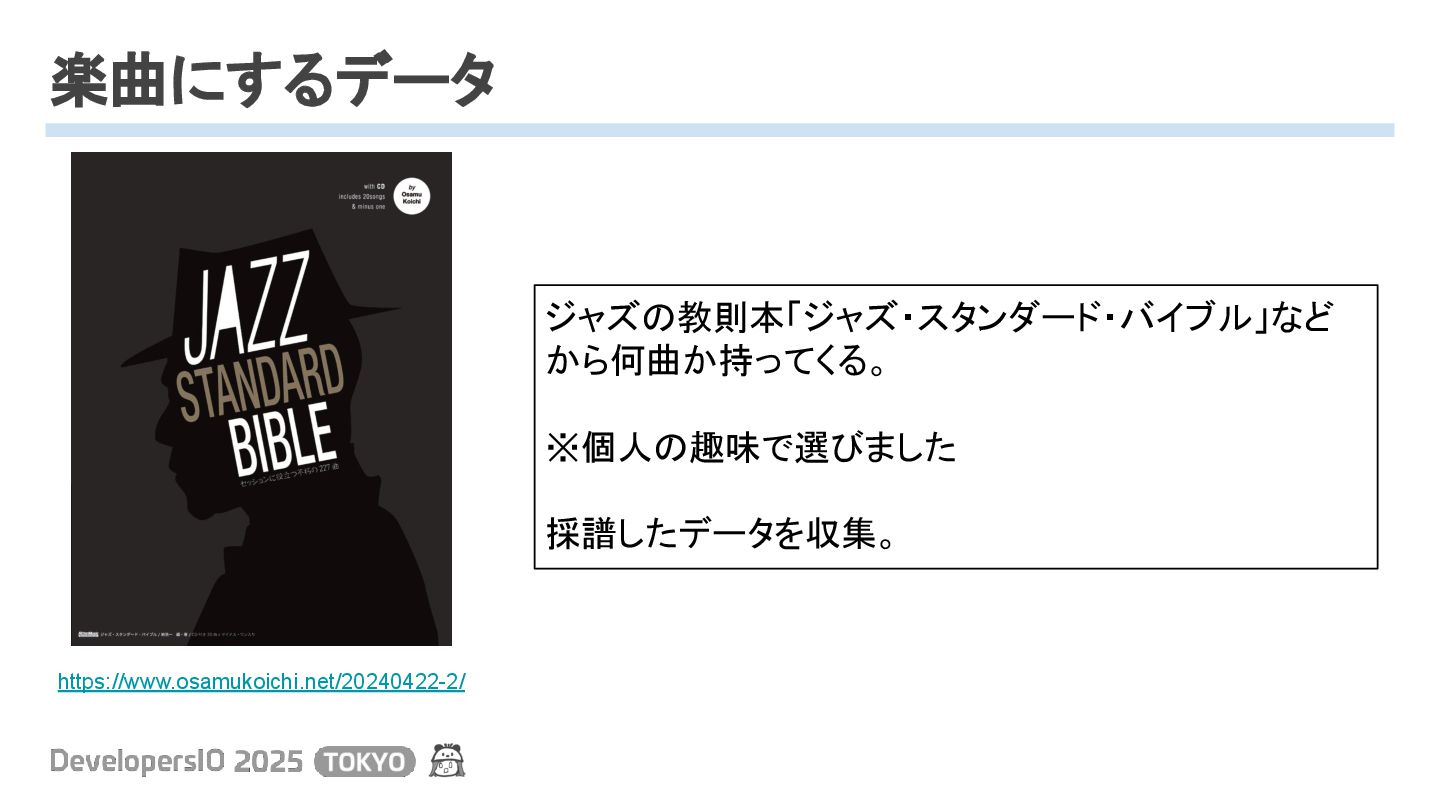 楽曲にするデータ ジャズの教則本「ジャズ・スタンダード・バイブル」など から何曲か持ってくる。 ※個人の趣味で選びました 採譜したデータを収集。 https://www.osamukoichi.net/20240422-2/