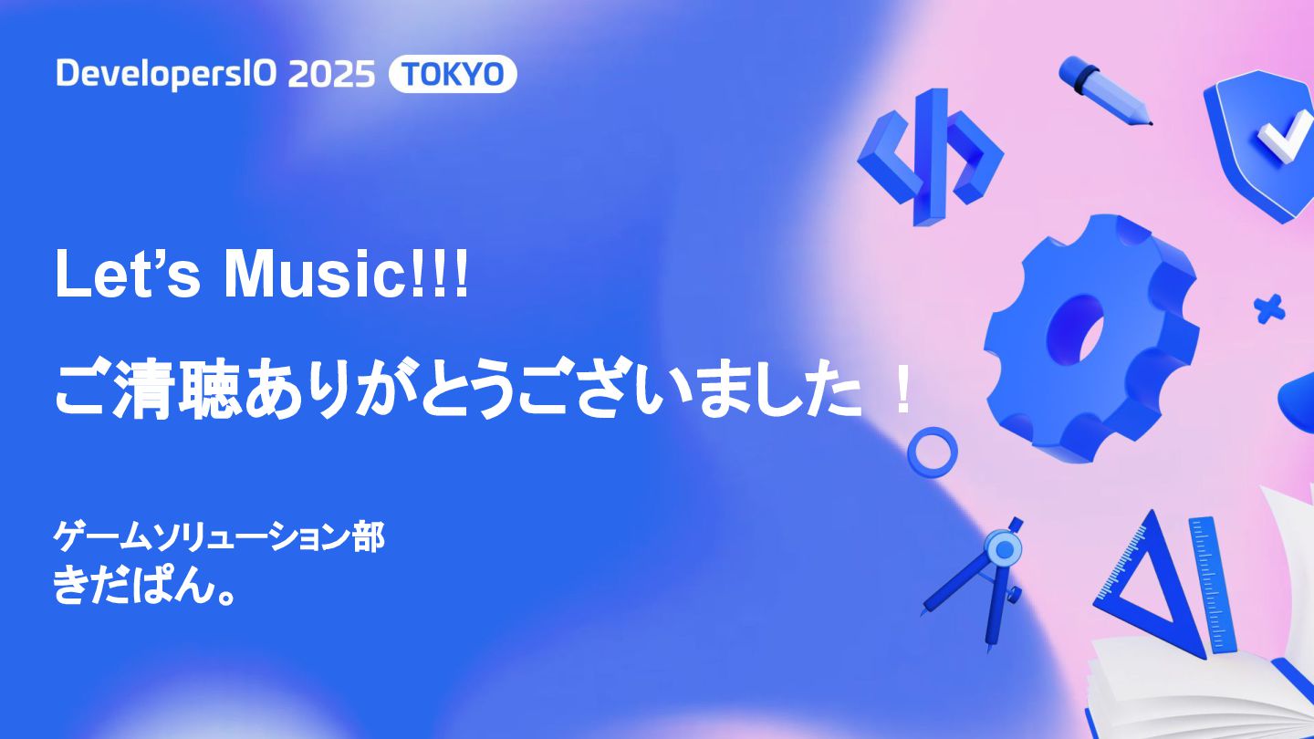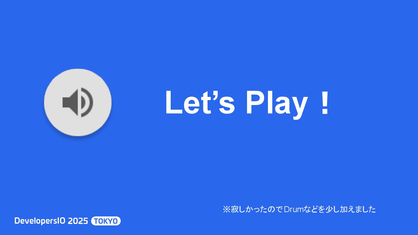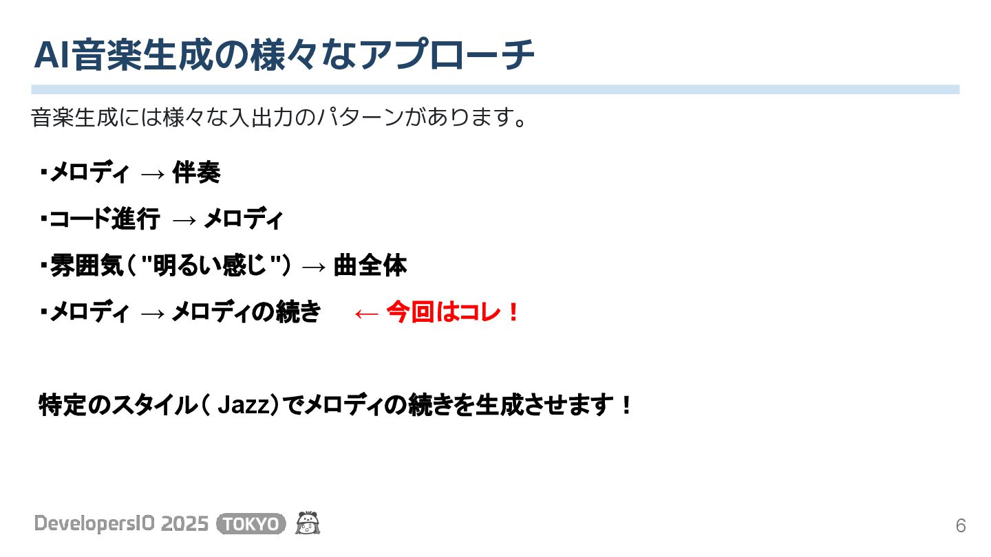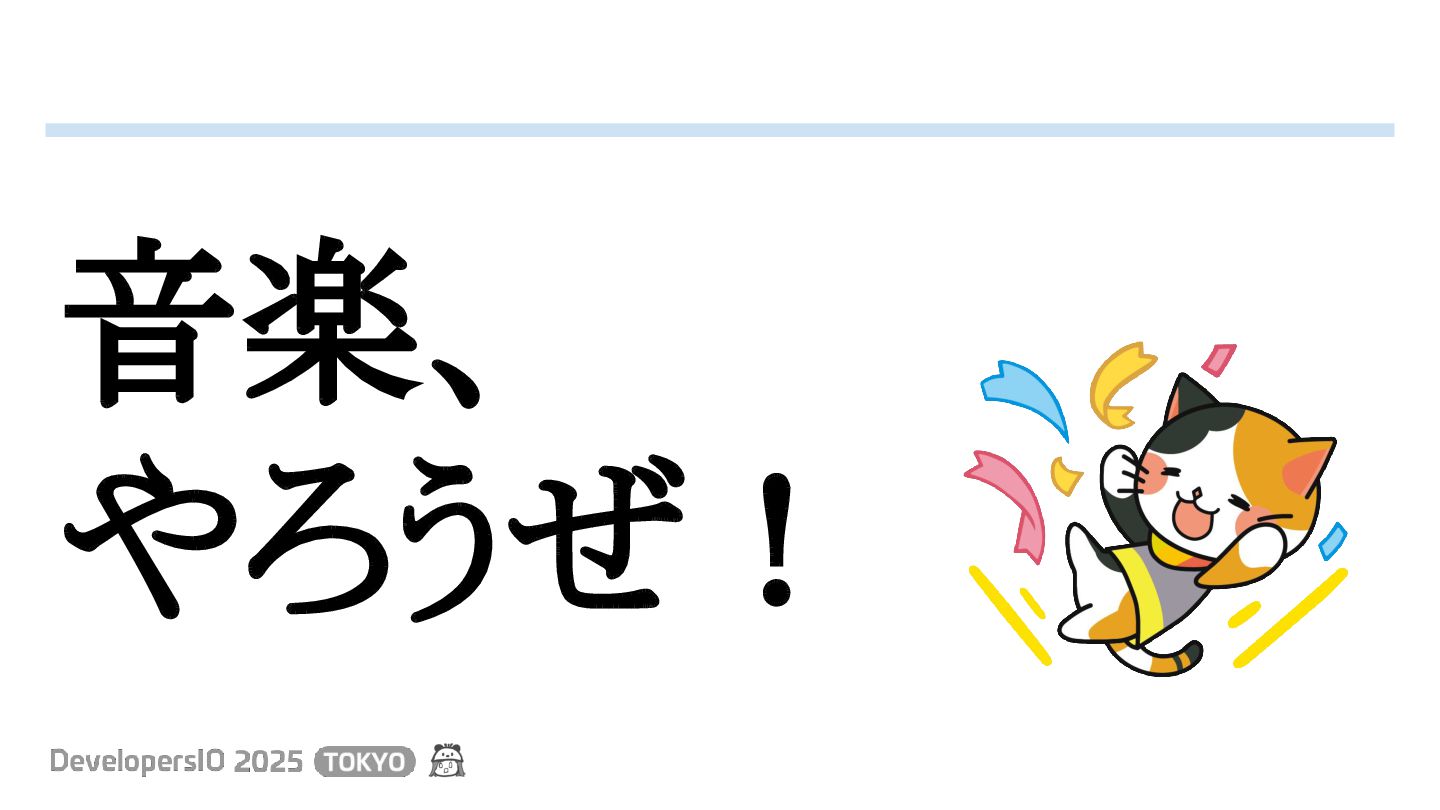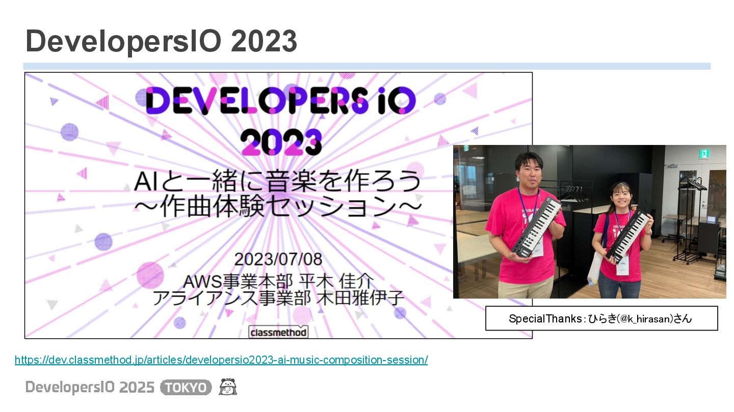 DevelopersIO 2023 https://dev.classmethod.jp/articles/developersio2023-ai-music-composition-session/ SpecialThanks:ひらき(@k_hirasan)さん