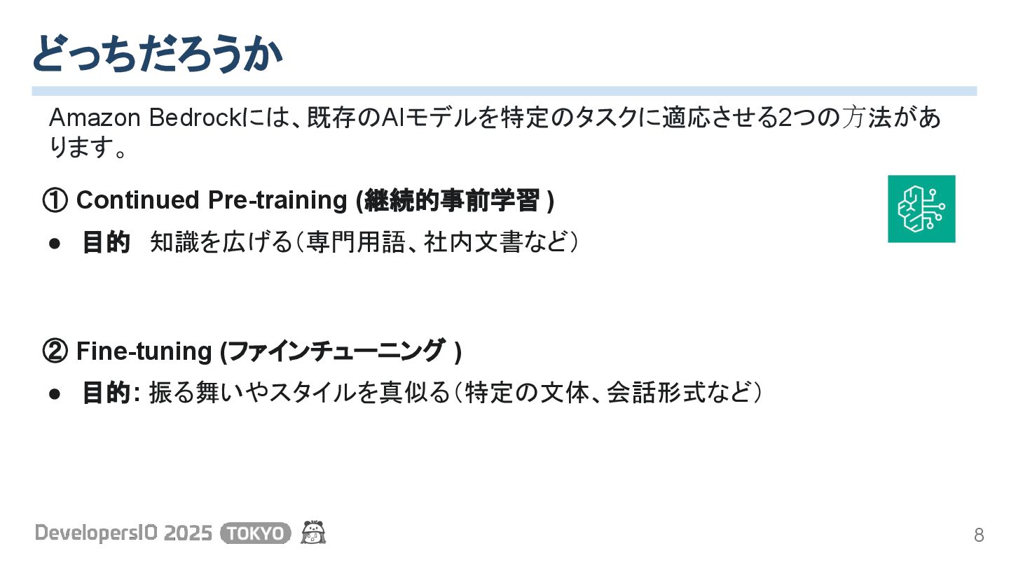 Amazon Bedrockには、既存のAIモデルを特定のタスクに適応させる2つの⽅法があ ります。 8 どっちだろうか ① Continued Pre-training (継続的事前学習 )