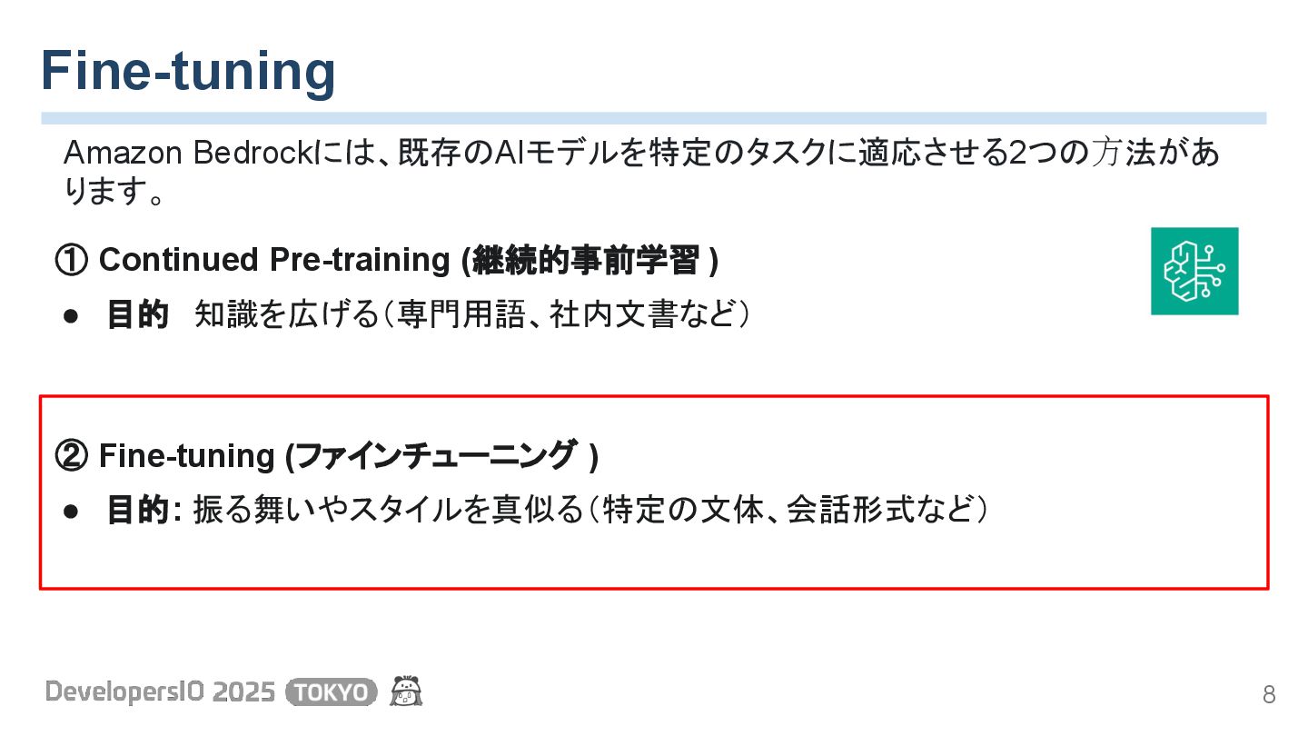• 目的 知識を広げる(専門用語、社内文書など) ② Fine-tuning (ファインチューニング ) • 目的: 振る舞いやスタイルを真似る(特定の文体、会話形式など)