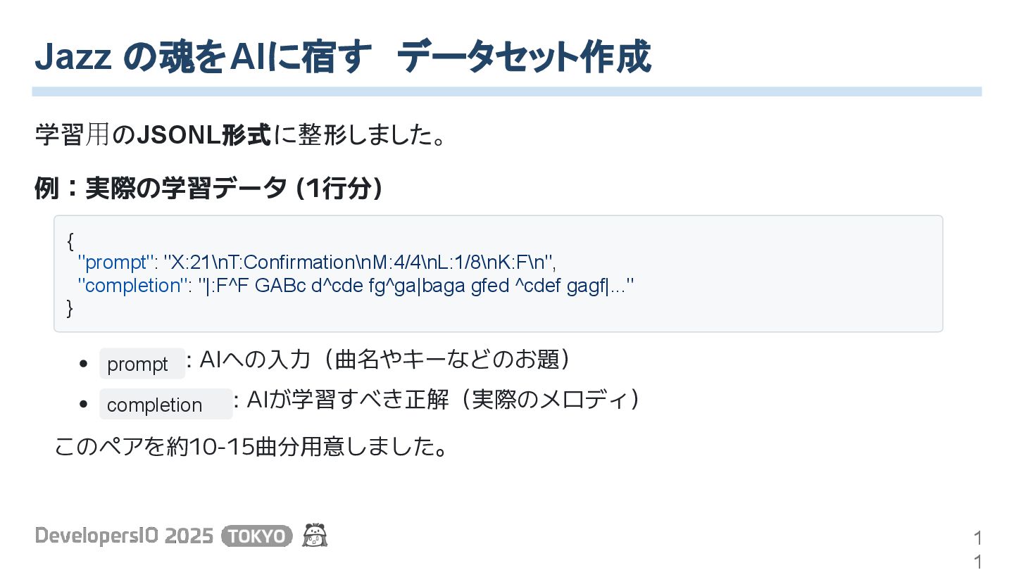 fg^ga|baga gfed ^cdef gagf|..." } prompt : AIへの⼊⼒(曲名やキーなどのお題) completion : AIが学習すべき正解(実際のメロディ) このペアを約10-15曲分⽤意しました。 1 1 Jazz の魂をAIに宿す データセット作成