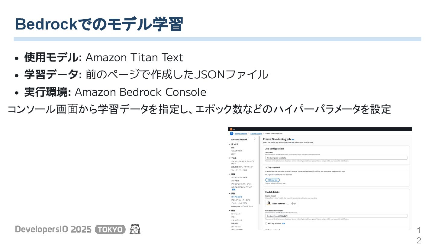 使⽤モデル: Amazon Titan Text 学習データ: 前のページで作成したJSONファイル 実⾏環境: Amazon Bedrock Console