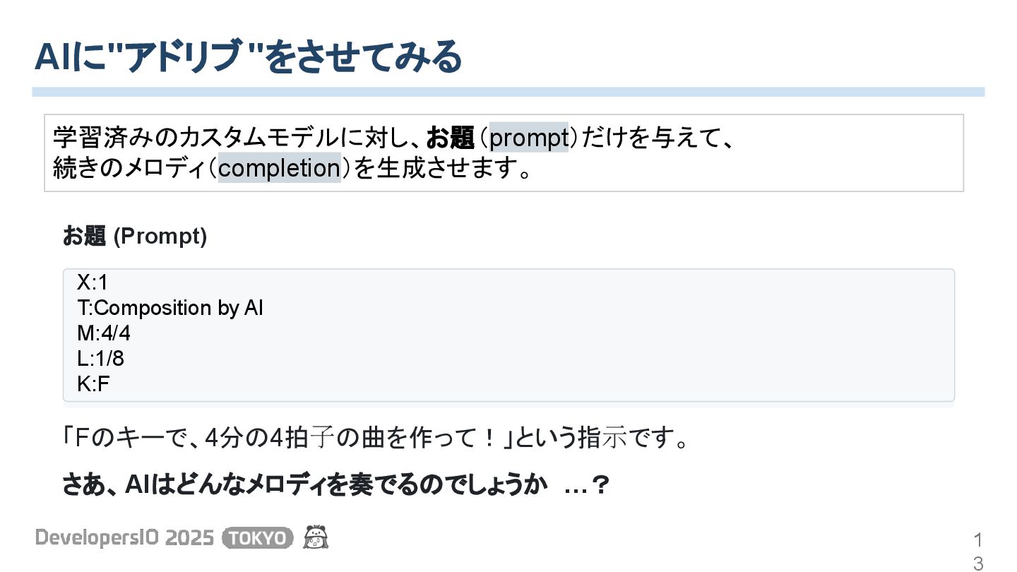 さあ、AIはどんなメロディを奏でるのでしょうか …? 1 3 AIに"アドリブ"をさせてみる 学習済みのカスタムモデルに対し、お題(prompt)だけを与えて、 続きのメロディ(completion)を生成させます。