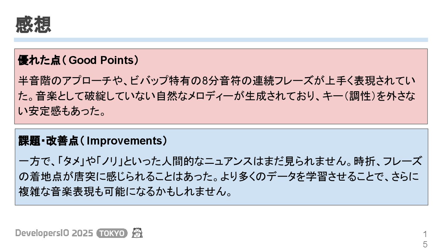 Improvements) 一方で、「タメ」や「ノリ」といった人間的なニュアンスはまだ見られません。時折、フレーズ の着地点が唐突に感じられることはあった。より多くのデータを学習させることで、さらに 複雑な音楽表現も可能になるかもしれません。