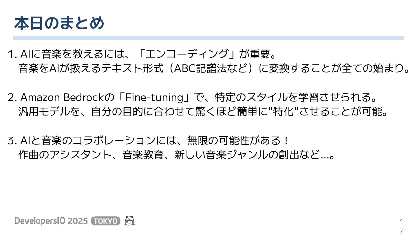 1 7 本⽇のまとめ 1. AIに⾳楽を教えるには、「エンコーディング」が重要。 ⾳楽をAIが扱えるテキスト形式(ABC記譜法など)に変換することが全ての始まり。 2. Amazon Bedrockの「Fine-tuning」で、特定のスタイルを学習させられる。 汎⽤モデルを、⾃分の⽬的に合わせて驚くほど簡単に"特化"させることが可能。