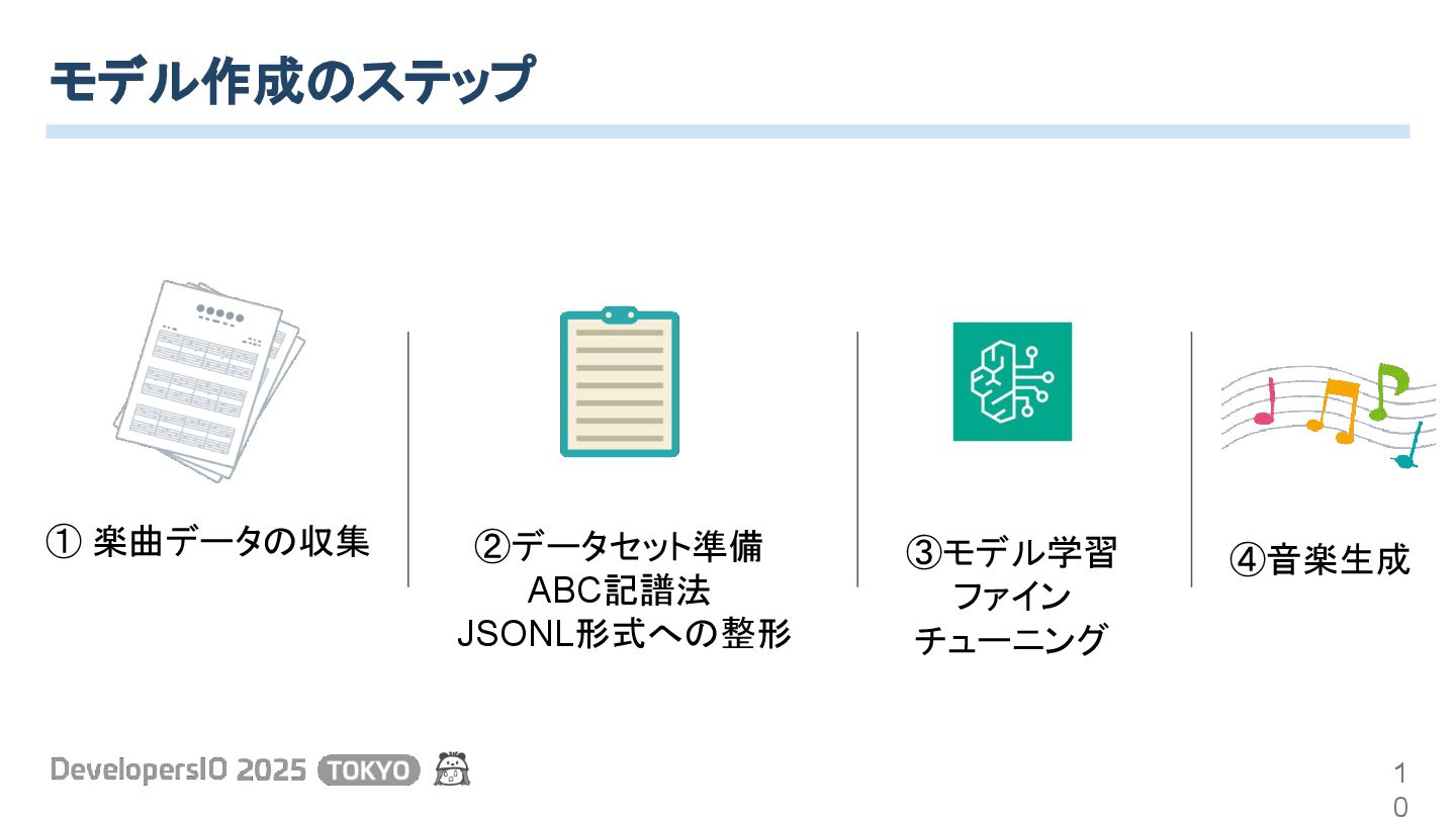 1 0 モデル作成のステップ ②データセット準備 ABC記譜法 JSONL形式への整形 ③モデル学習 ファイン チューニング ④音楽生成