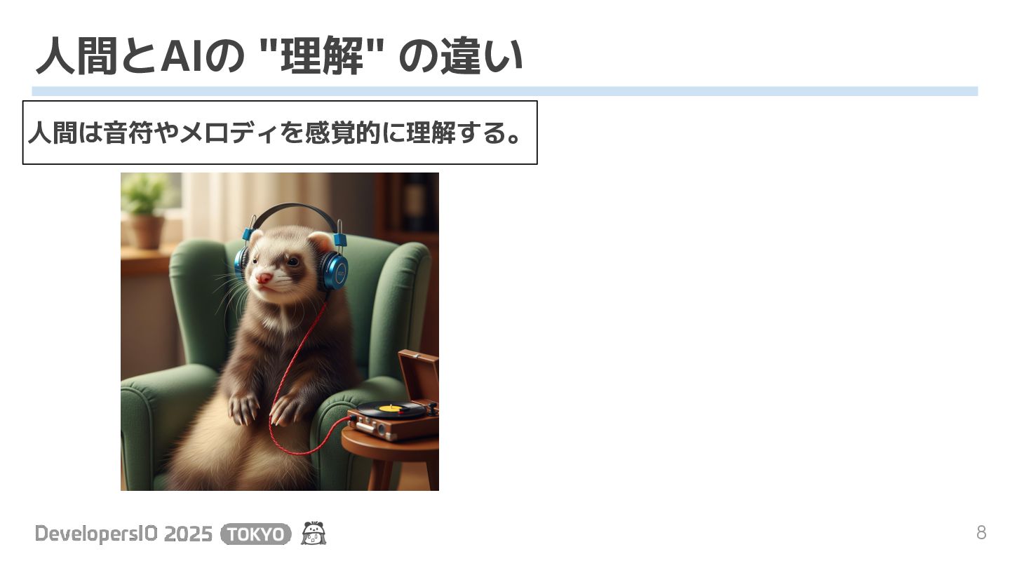 ⼈間とAIの "理解" の違い 8 ⼈間は⾳符やメロディを感覚的に理解する。