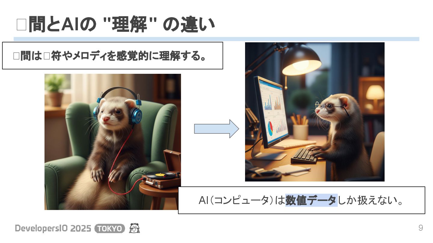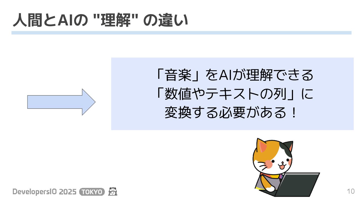 ⾳間とAIの "理解" の違い 9 ⾳間は⾳符やメロディを感覚的に理解する。 AI(コンピュータ)は数値データ しか扱えない。