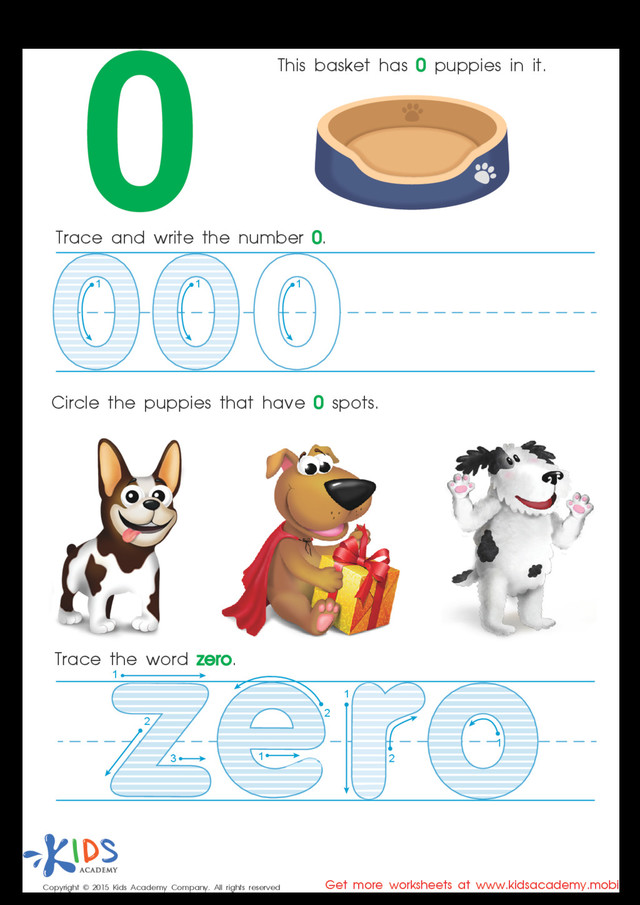 A new set of free printable number and handwriting worksheets by Kids Academy. Print out these brightly-colored kindergarten worksheets and your little learner will get a chance to practice his counting, handwriting and spelling skills at a time. To complete the task, children need to trace numbers and numerals following the arrows. They are also challenged to write numbers independently and count various objects. With these free math worksheets, you child will learn to recognize one-digit numbers in no time. He will have some fun too.