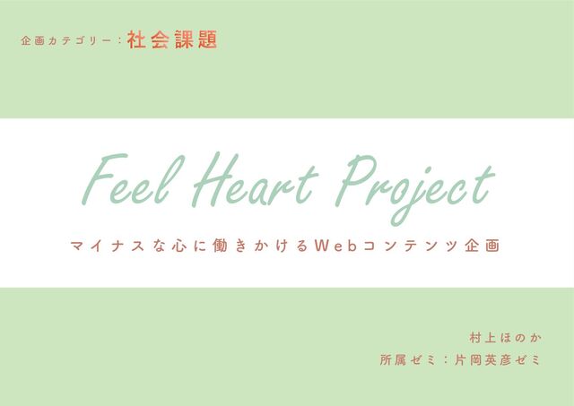 心 に 働 き か け る W e b コ ン テ ン ツ 企 画 所 属 ゼ ミ : 片 岡 英 彦 ゼ ミ 企 画 カ テ ゴ リ ー : Feel Heart Project