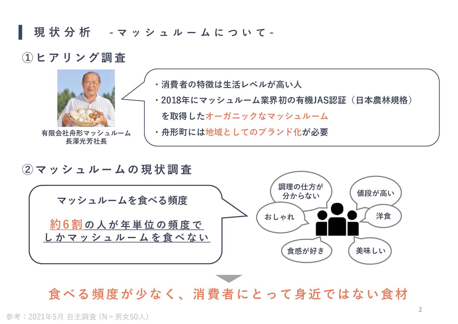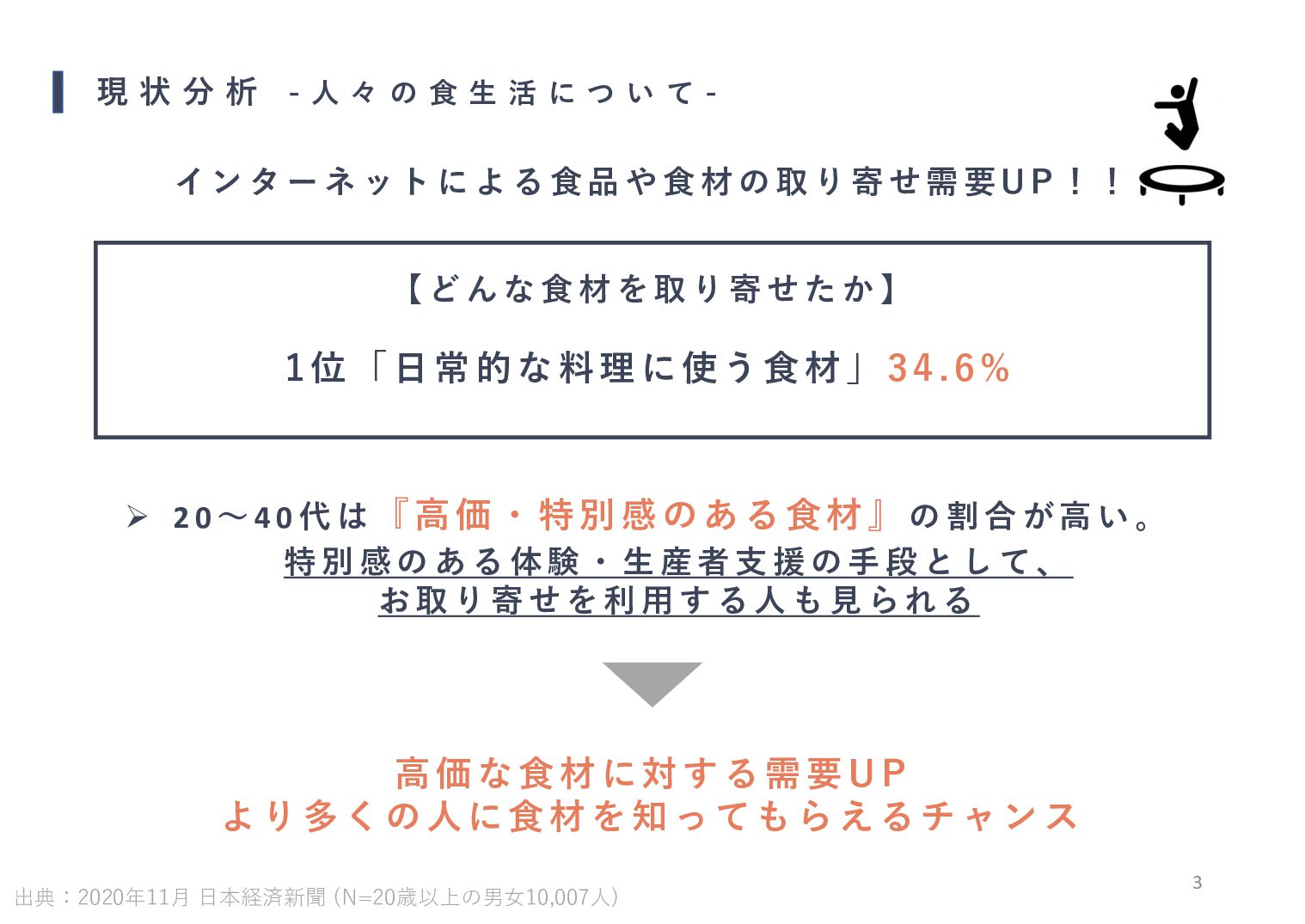 活 に つ い て - 3 イ ン タ ー ネ ッ ト に よ る 食 品 や 食 材 の 取 り 寄 せ 需 要 U P ! ! 1位「日常的な料理に使う食材 」 34. 6% 【 ど ん な 食 材 を 取 り 寄 せ た か 】 2 0 ~ 4 0 代 は 『高価・ 特 別 感 の あ る食材 』の 割 合 が 高 い 。 特 別 感 の あ る 体 験 ・ 生 産 者 支 援 の 手 段 と し て 、 お 取 り 寄 せ を 利 用 す る 人 も 見 ら れ る 高価な食材に対する需要 UP より多くの人に食材を知ってもらえるチャンス 出典:2020年11月 日本経済新聞 (N=20歳以上の男女10,007人)