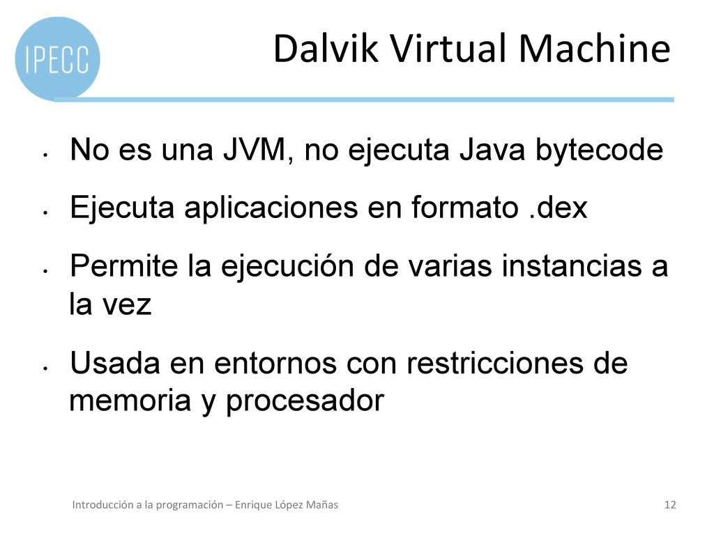 Dalvik Virtual Machine • No es una JVM, no ejecuta Java bytecode • Ejecuta aplicaciones en formato .dex • Permite la ejecución de varias instancias a la vez • Usada en entornos con restricciones de memoria y procesador