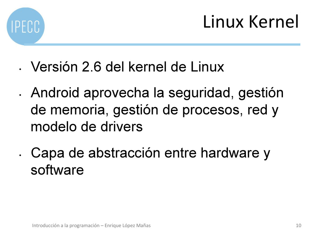 Linux Kernel • Versión 2.6 del kernel de Linux • Android aprovecha la seguridad, gestión de memoria, gestión de procesos, red y modelo de drivers • Capa de abstracción entre hardware y software
