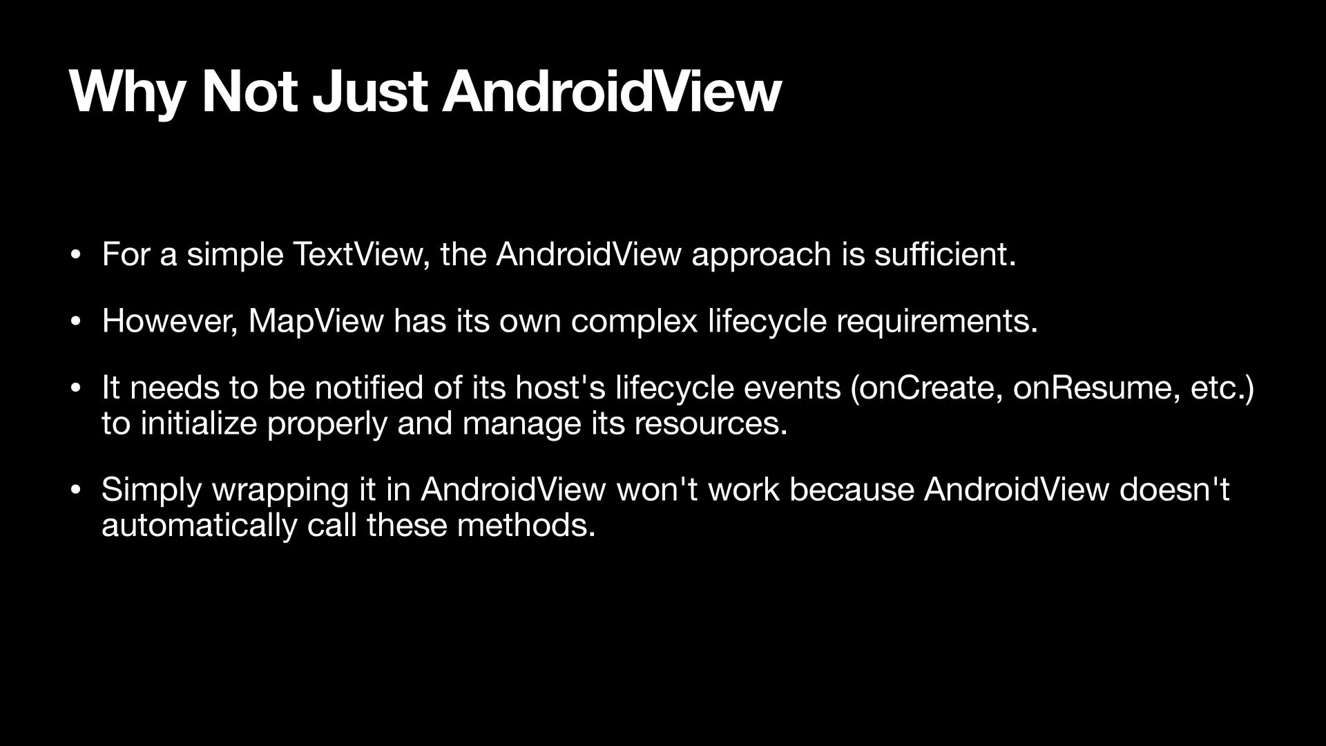AndroidView approach is su ff i cient. • However, MapView has its own complex lifecycle requirements. • It needs to be noti fi ed of its host's lifecycle events (onCreate, onResume, etc.) to initialize properly and manage its resources. • Simply wrapping it in AndroidView won't work because AndroidView doesn't automatically call these methods.