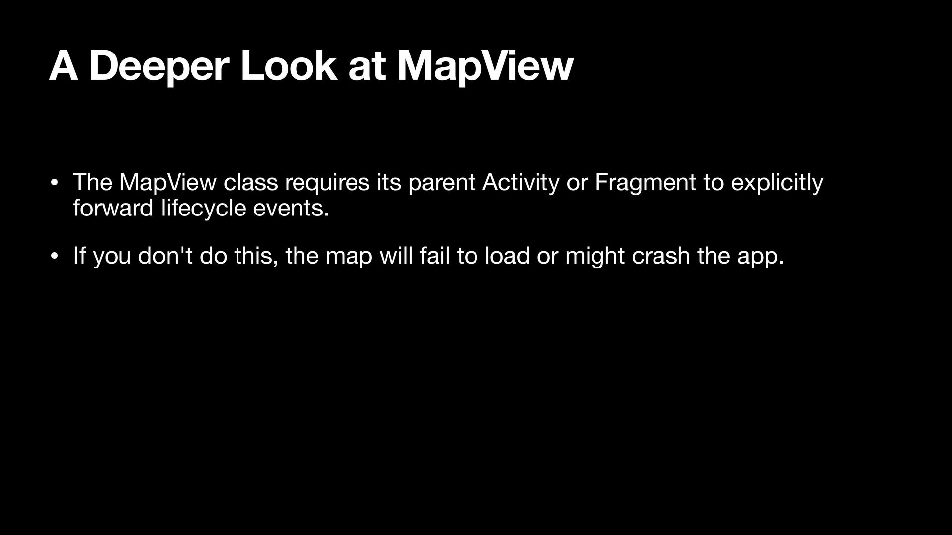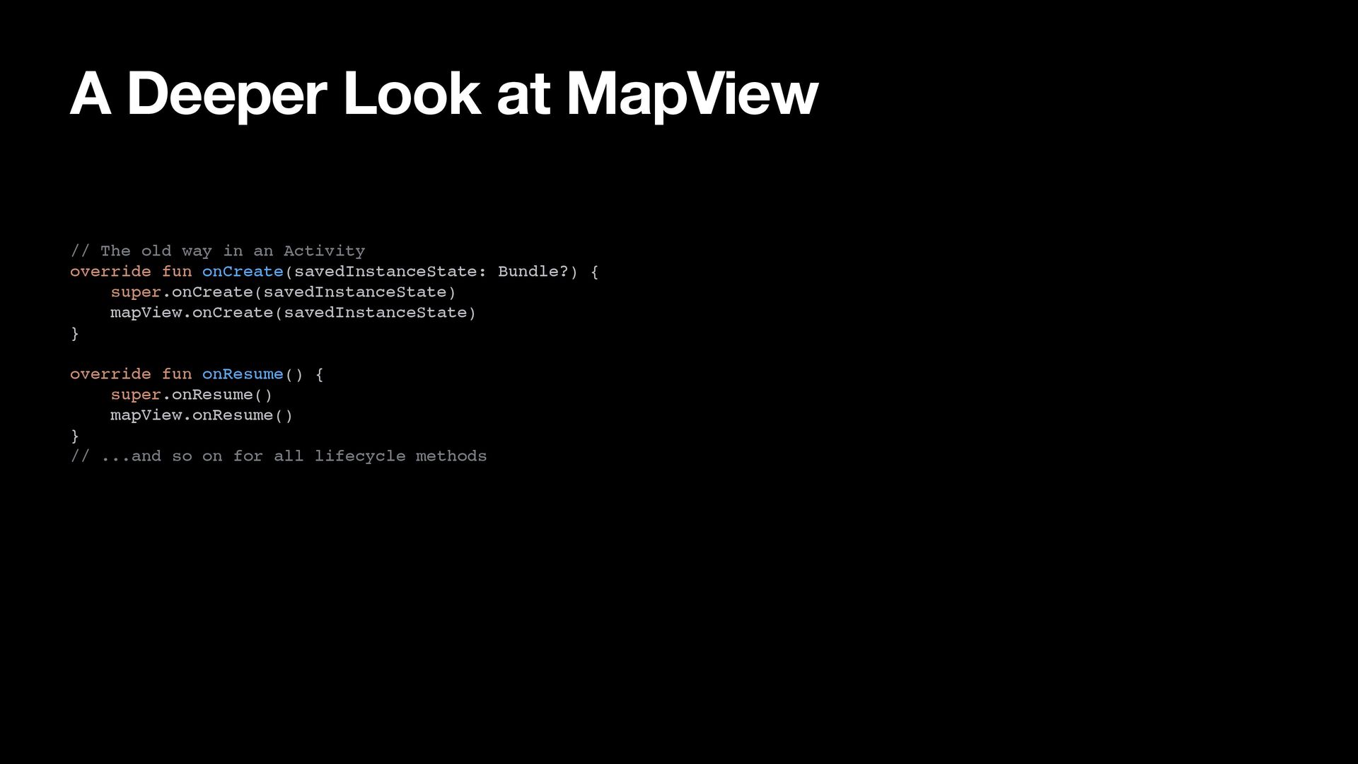 an Activity override fun onCreate(savedInstanceState: Bundle?) { super.onCreate(savedInstanceState) mapView.onCreate(savedInstanceState) } override fun onResume() { super.onResume() mapView.onResume() } // ...and so on for all lifecycle methods