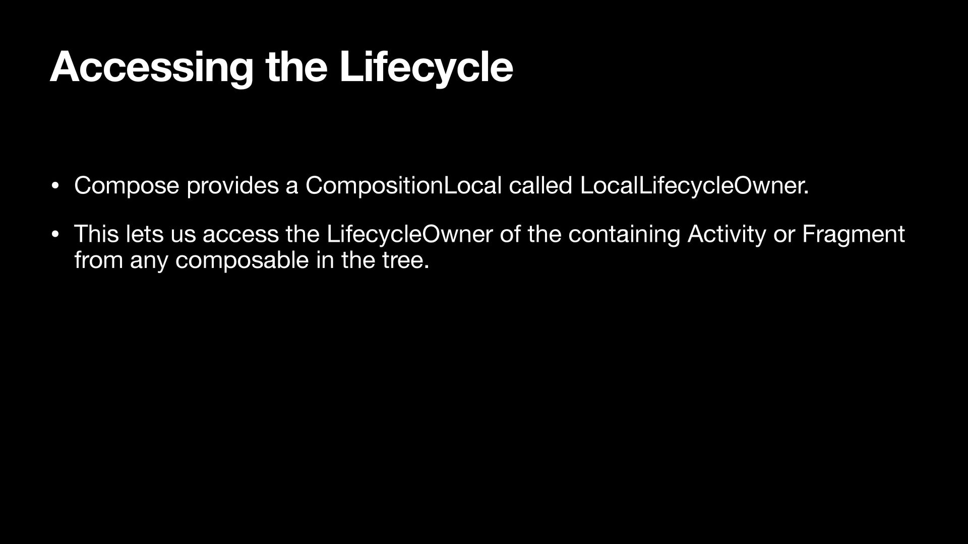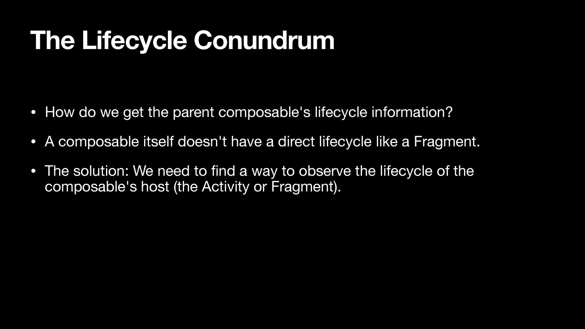 composable's lifecycle information? • A composable itself doesn't have a direct lifecycle like a Fragment. • The solution: We need to fi nd a way to observe the lifecycle of the composable's host (the Activity or Fragment).