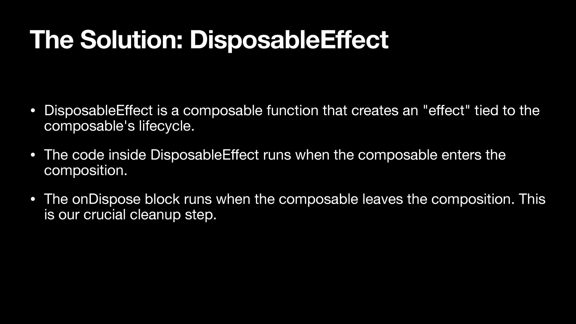 a composable function that creates an "e ff ect" tied to the composable's lifecycle. • The code inside DisposableE ff ect runs when the composable enters the composition. • The onDispose block runs when the composable leaves the composition. This is our crucial cleanup step.