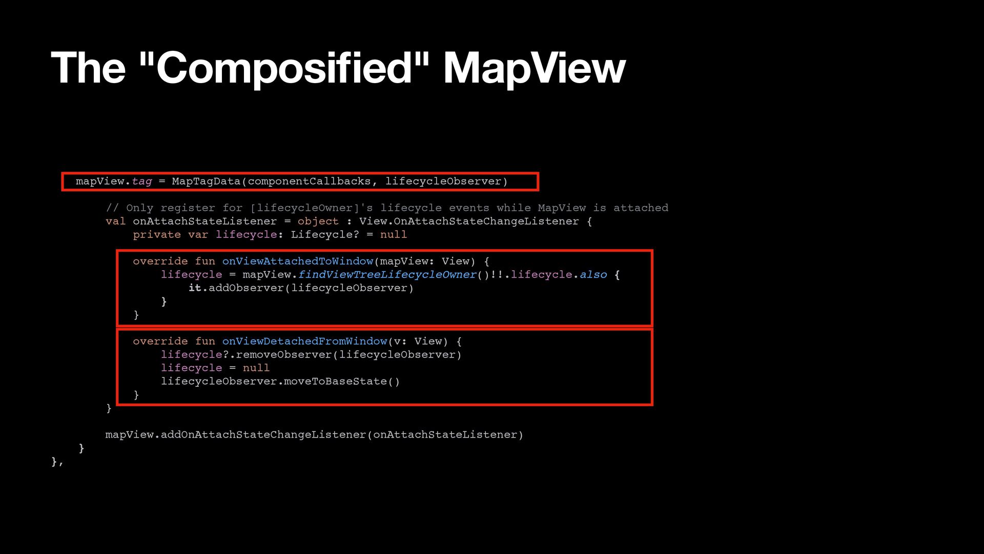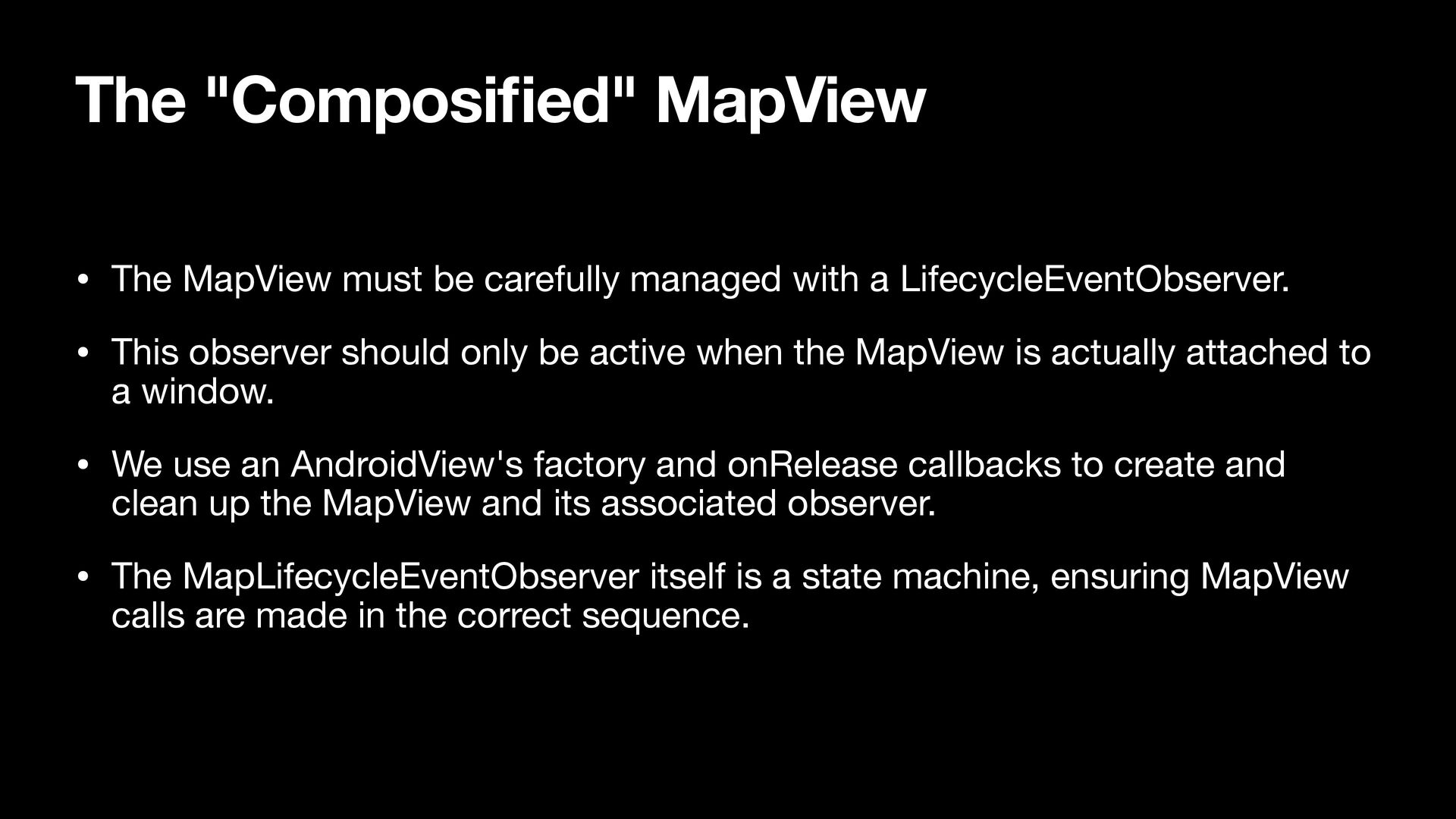 carefully managed with a LifecycleEventObserver. • This observer should only be active when the MapView is actually attached to a window. • We use an AndroidView's factory and onRelease callbacks to create and clean up the MapView and its associated observer. • The MapLifecycleEventObserver itself is a state machine, ensuring MapView calls are made in the correct sequence.