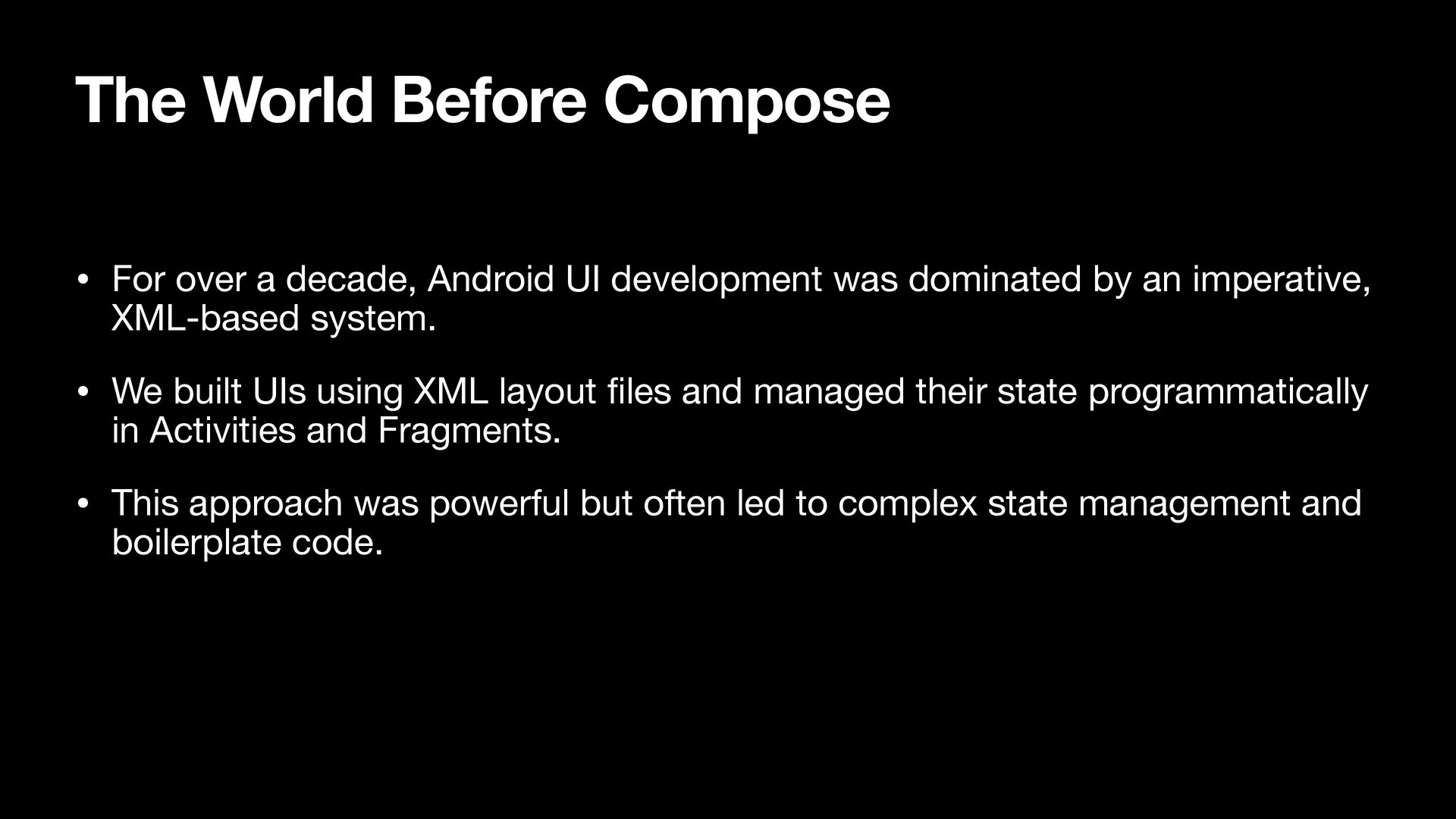 UI development was dominated by an imperative, XML-based system. • We built UIs using XML layout fi les and managed their state programmatically in Activities and Fragments. • This approach was powerful but often led to complex state management and boilerplate code.