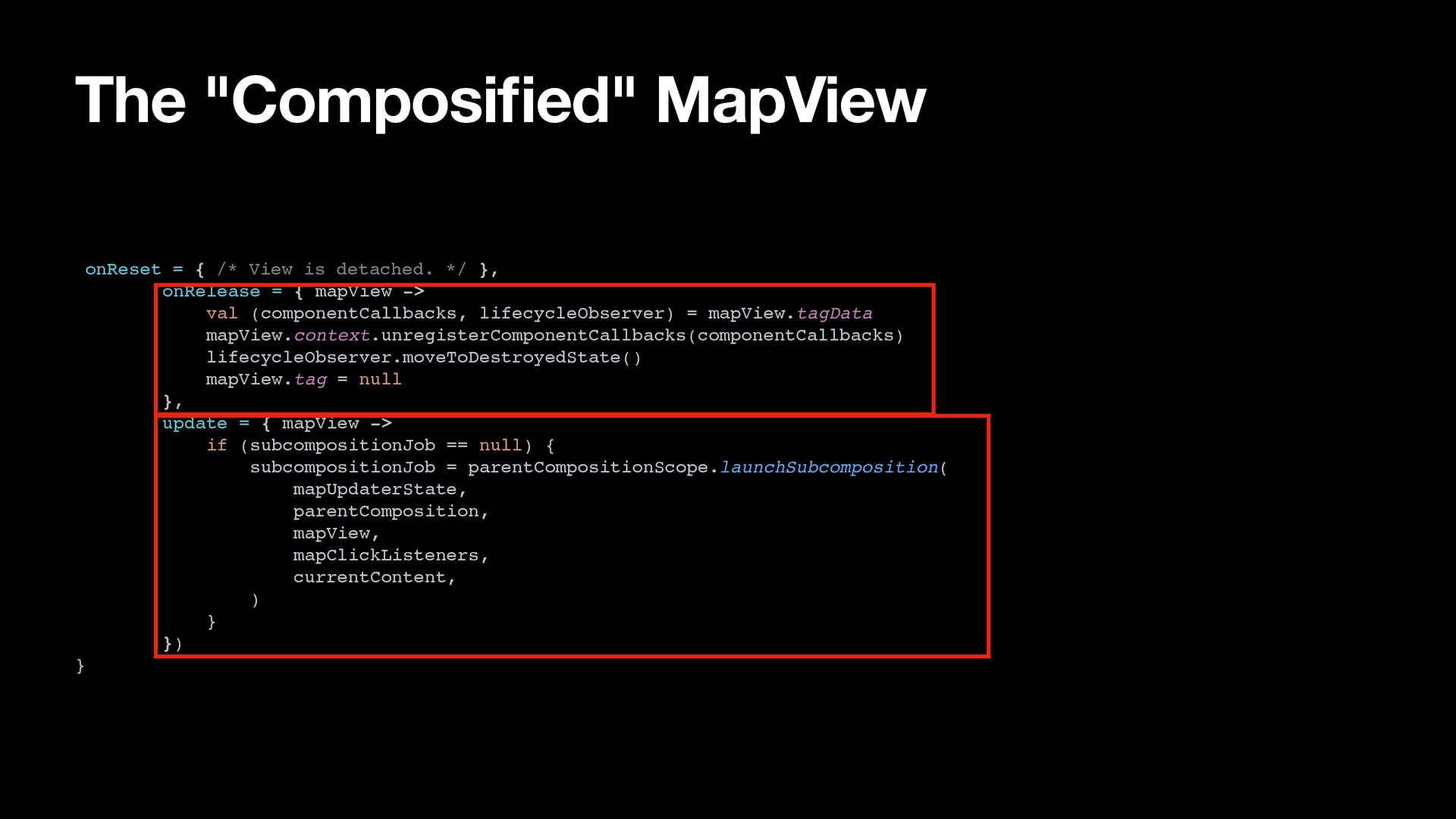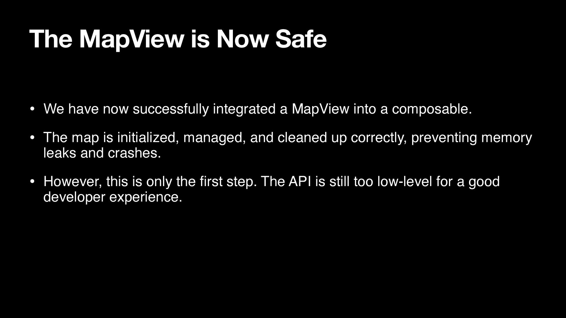 integrated a MapView into a composable. • The map is initialized, managed, and cleaned up correctly, preventing memory leaks and crashes. • However, this is only the fi rst step. The API is still too low-level for a good developer experience.