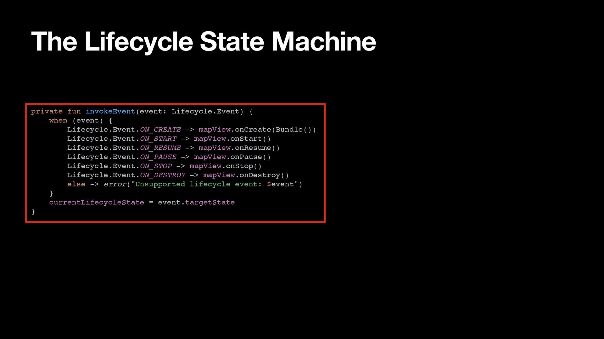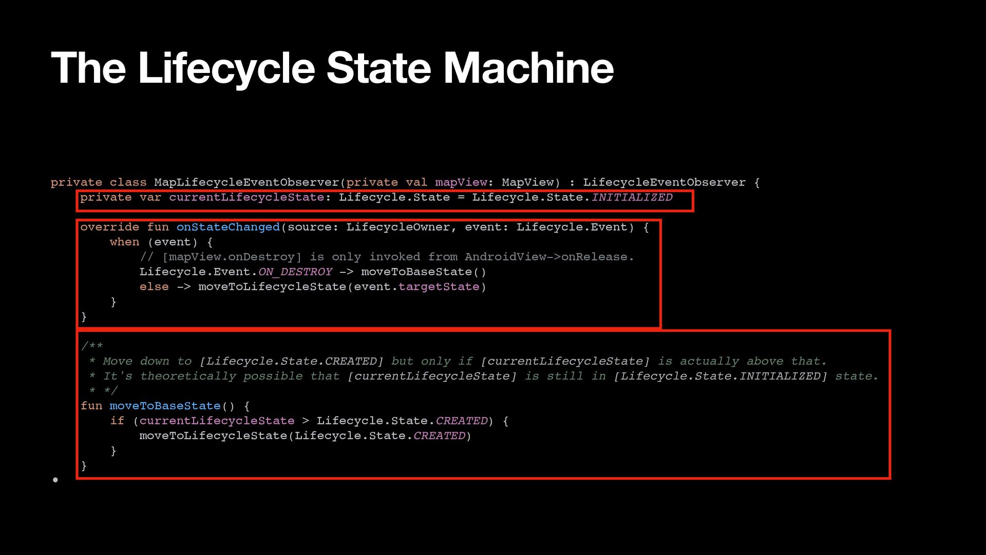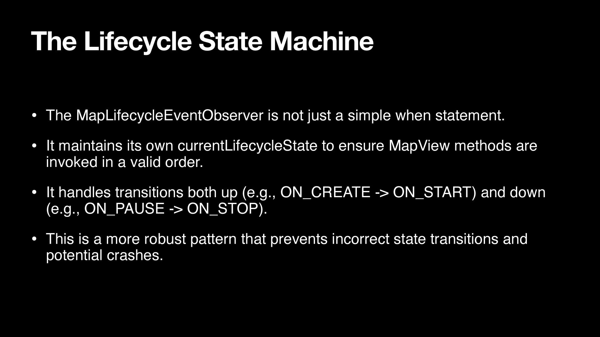 a simple when statement. • It maintains its own currentLifecycleState to ensure MapView methods are invoked in a valid order. • It handles transitions both up (e.g., ON_CREATE -> ON_START) and down (e.g., ON_PAUSE -> ON_STOP). • This is a more robust pattern that prevents incorrect state transitions and potential crashes.