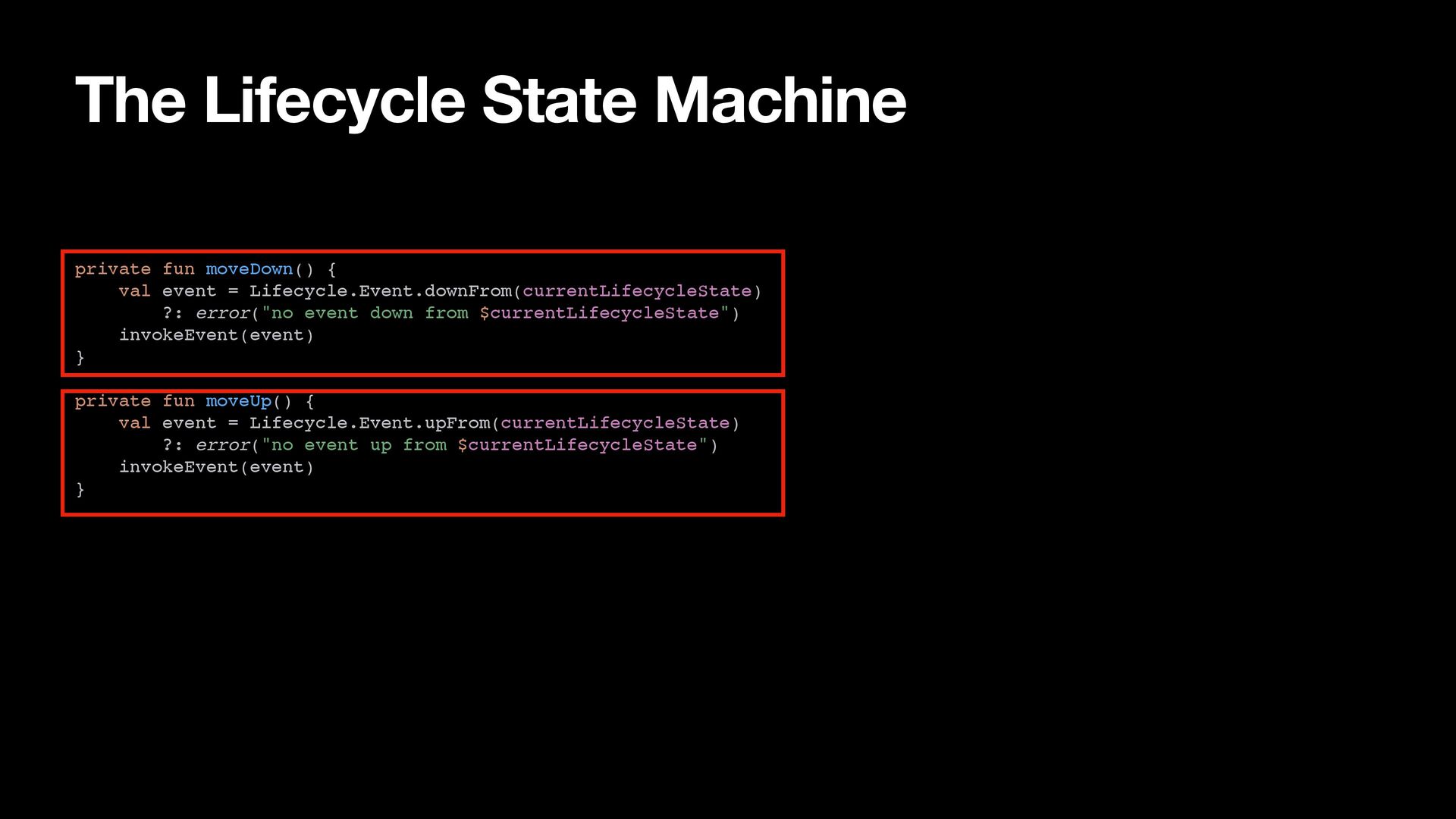 = Lifecycle.Event.downFrom(currentLifecycleState) ?: error("no event down from $currentLifecycleState") invokeEvent(event) } private fun moveUp() { val event = Lifecycle.Event.upFrom(currentLifecycleState) ?: error("no event up from $currentLifecycleState") invokeEvent(event) }