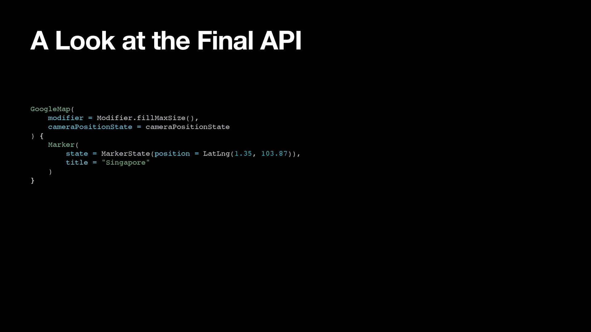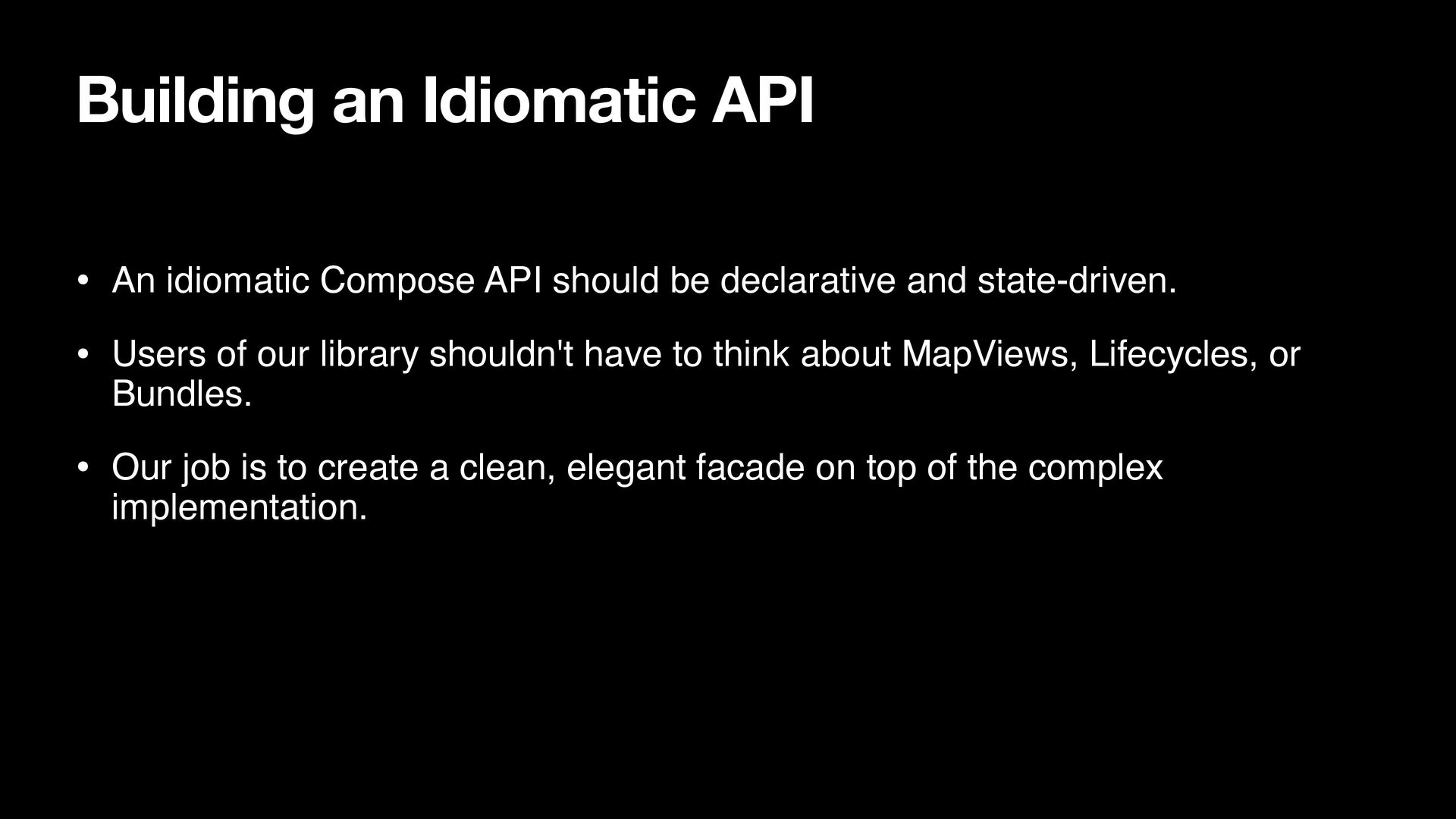be declarative and state-driven. • Users of our library shouldn't have to think about MapViews, Lifecycles, or Bundles. • Our job is to create a clean, elegant facade on top of the complex implementation.