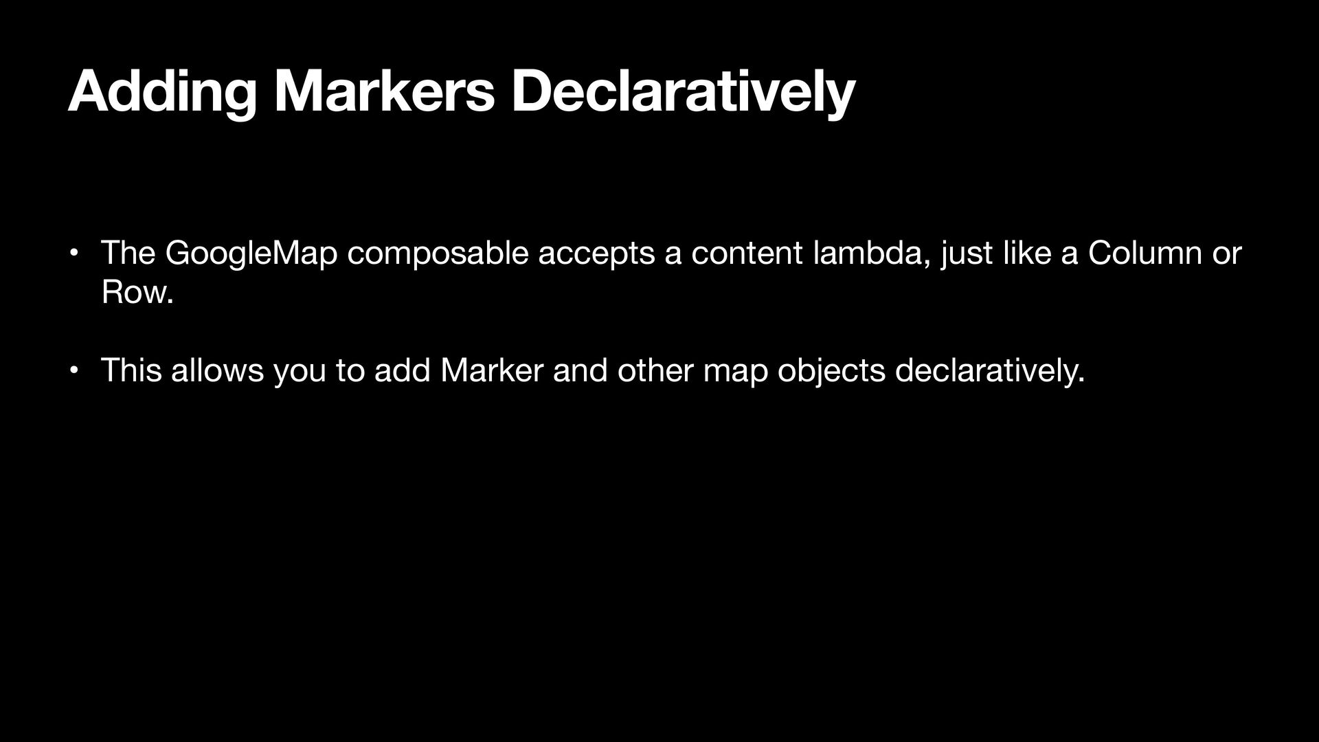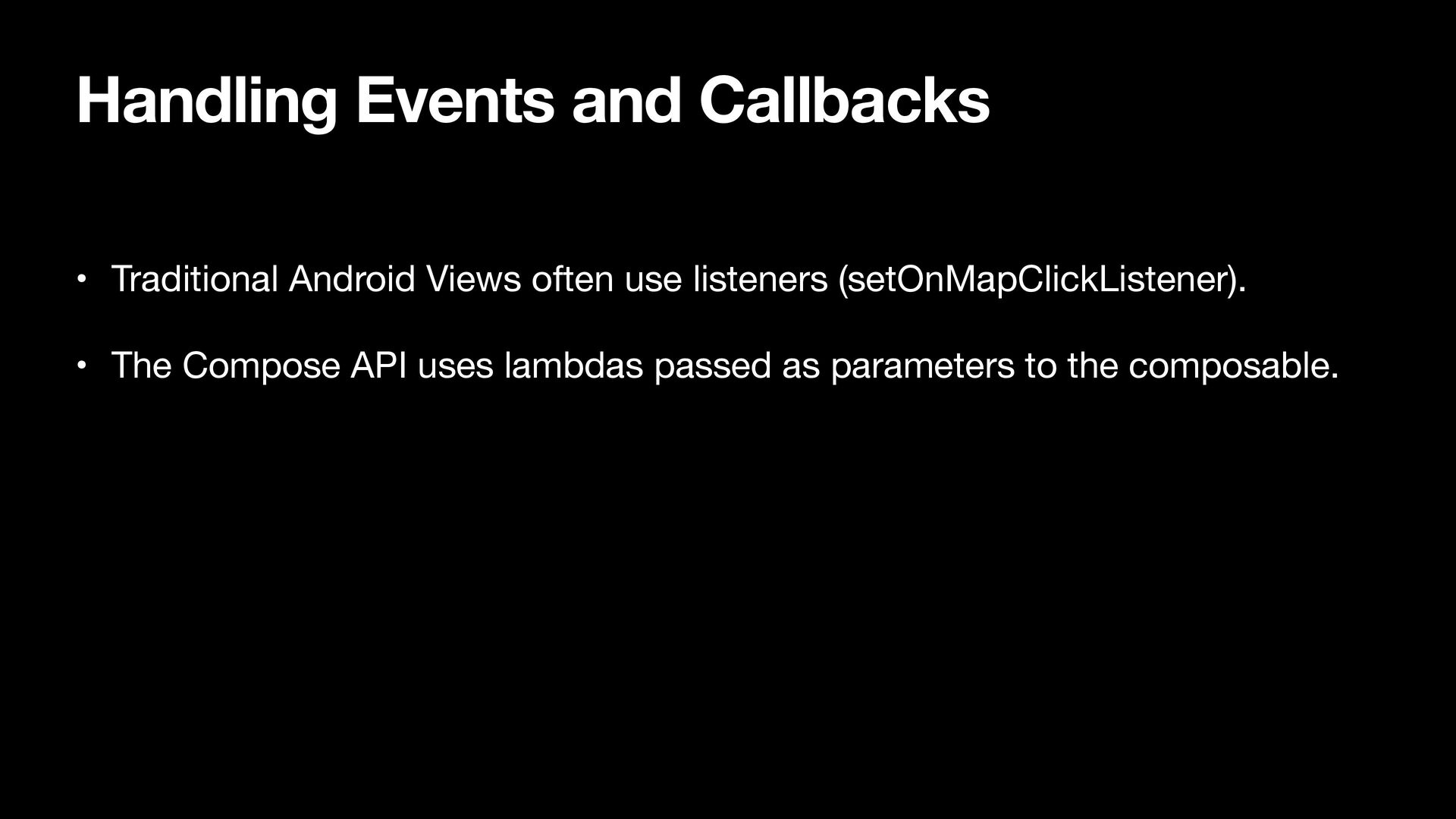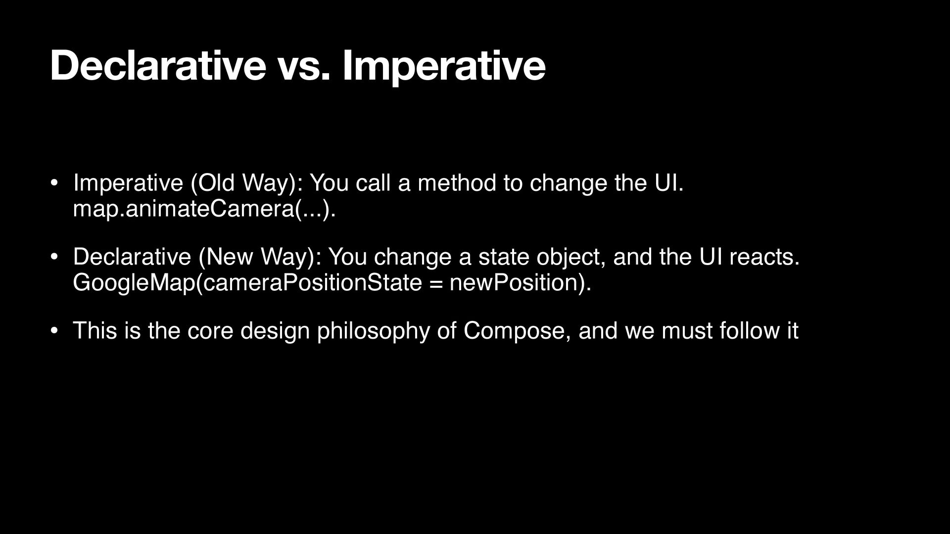 method to change the UI. map.animateCamera(...). • Declarative (New Way): You change a state object, and the UI reacts. GoogleMap(cameraPositionState = newPosition). • This is the core design philosophy of Compose, and we must follow it