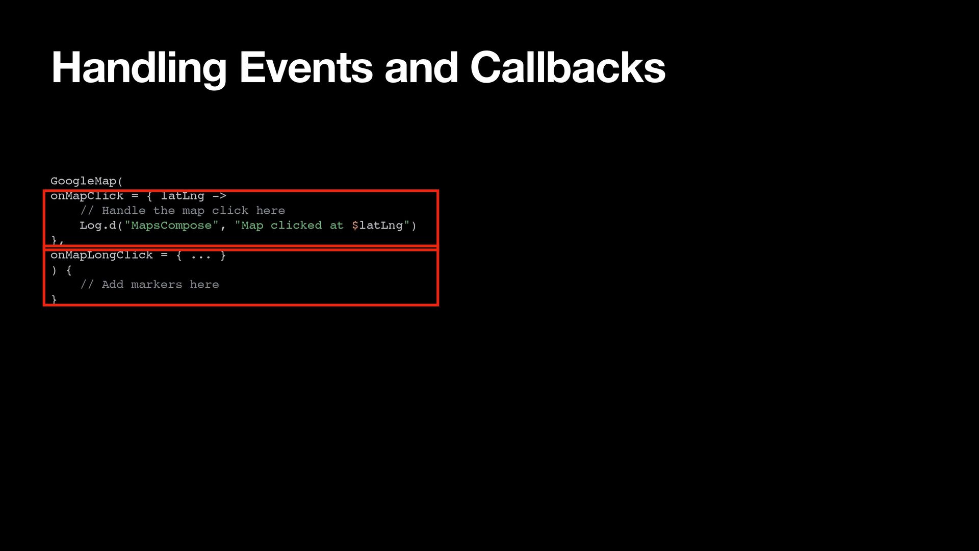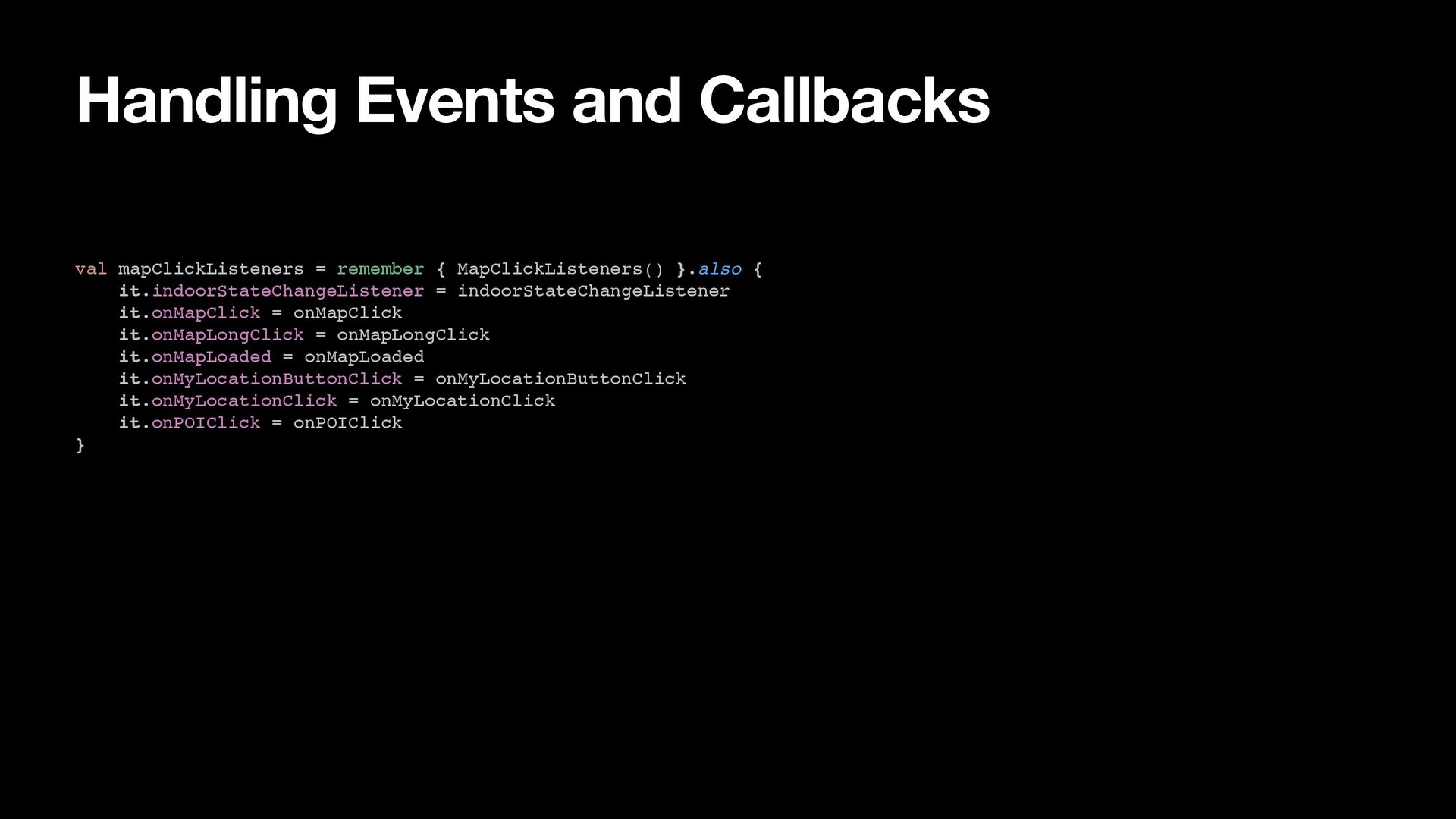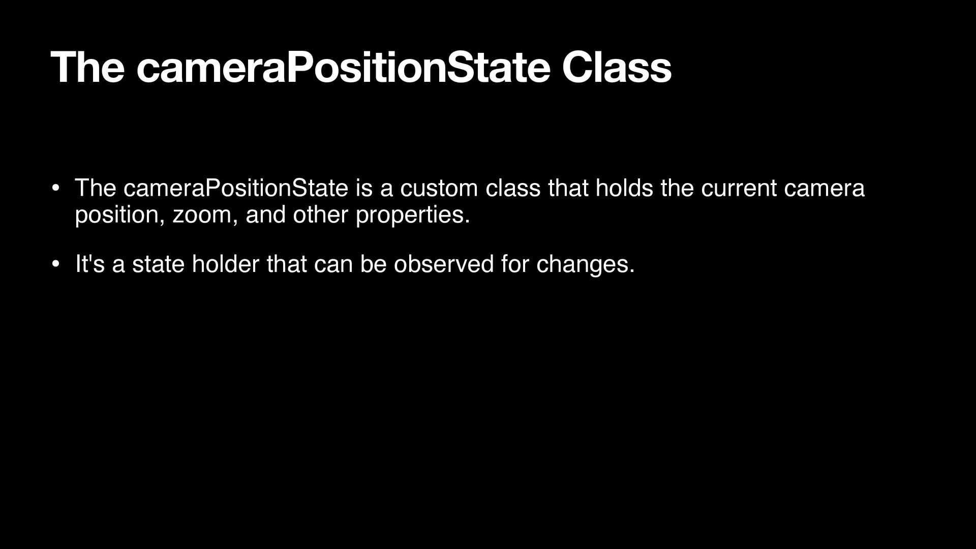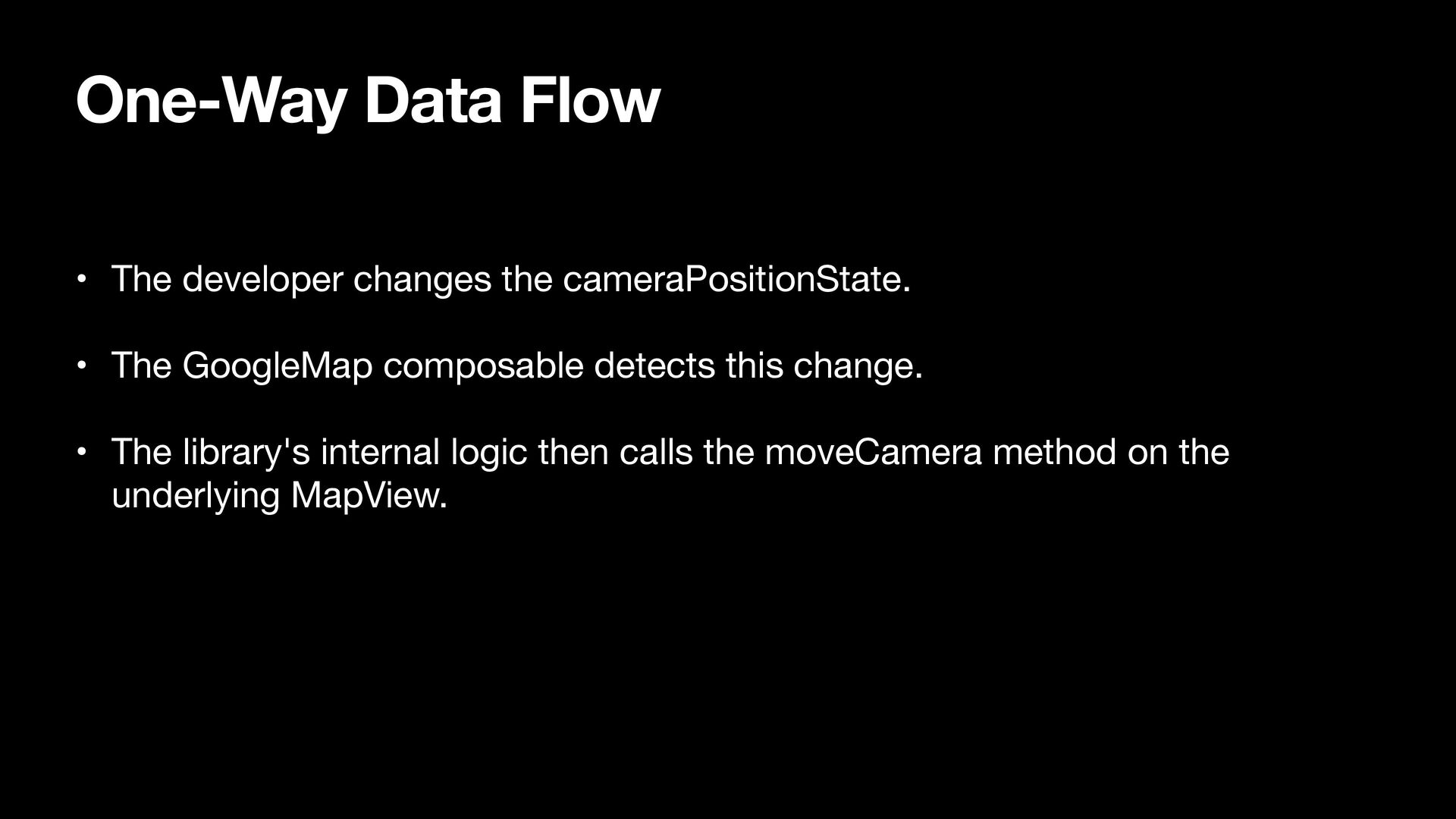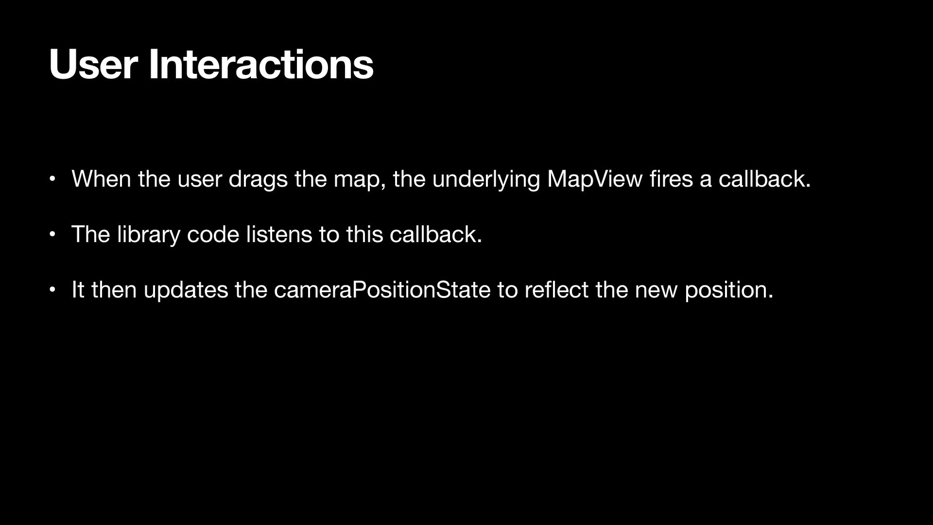 underlying MapView fi res a callback. • The library code listens to this callback. • It then updates the cameraPositionState to re fl ect the new position.