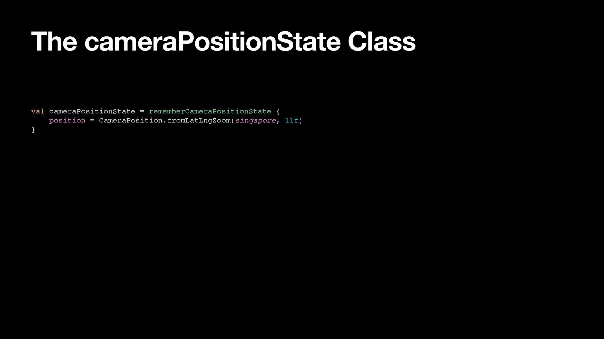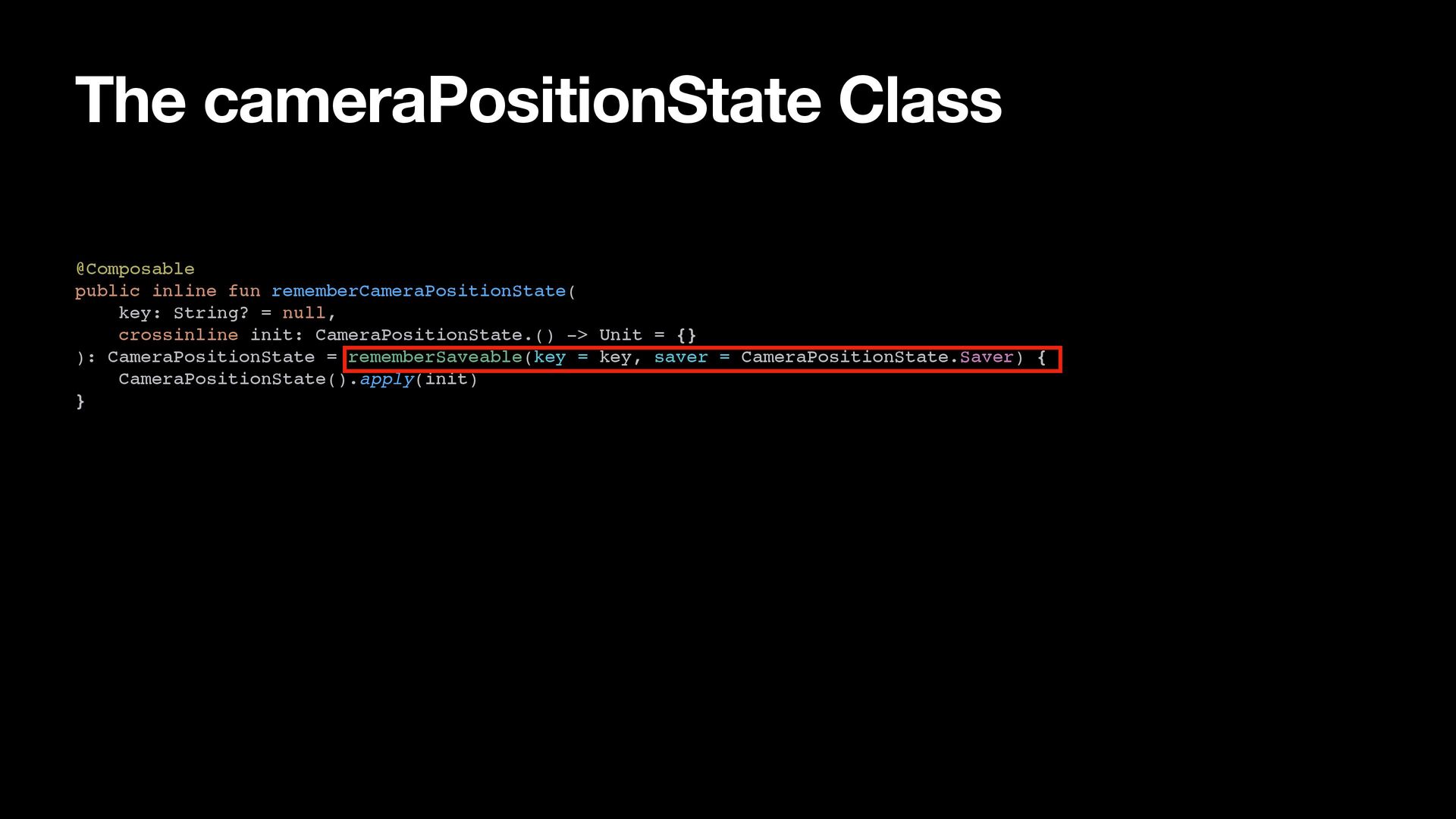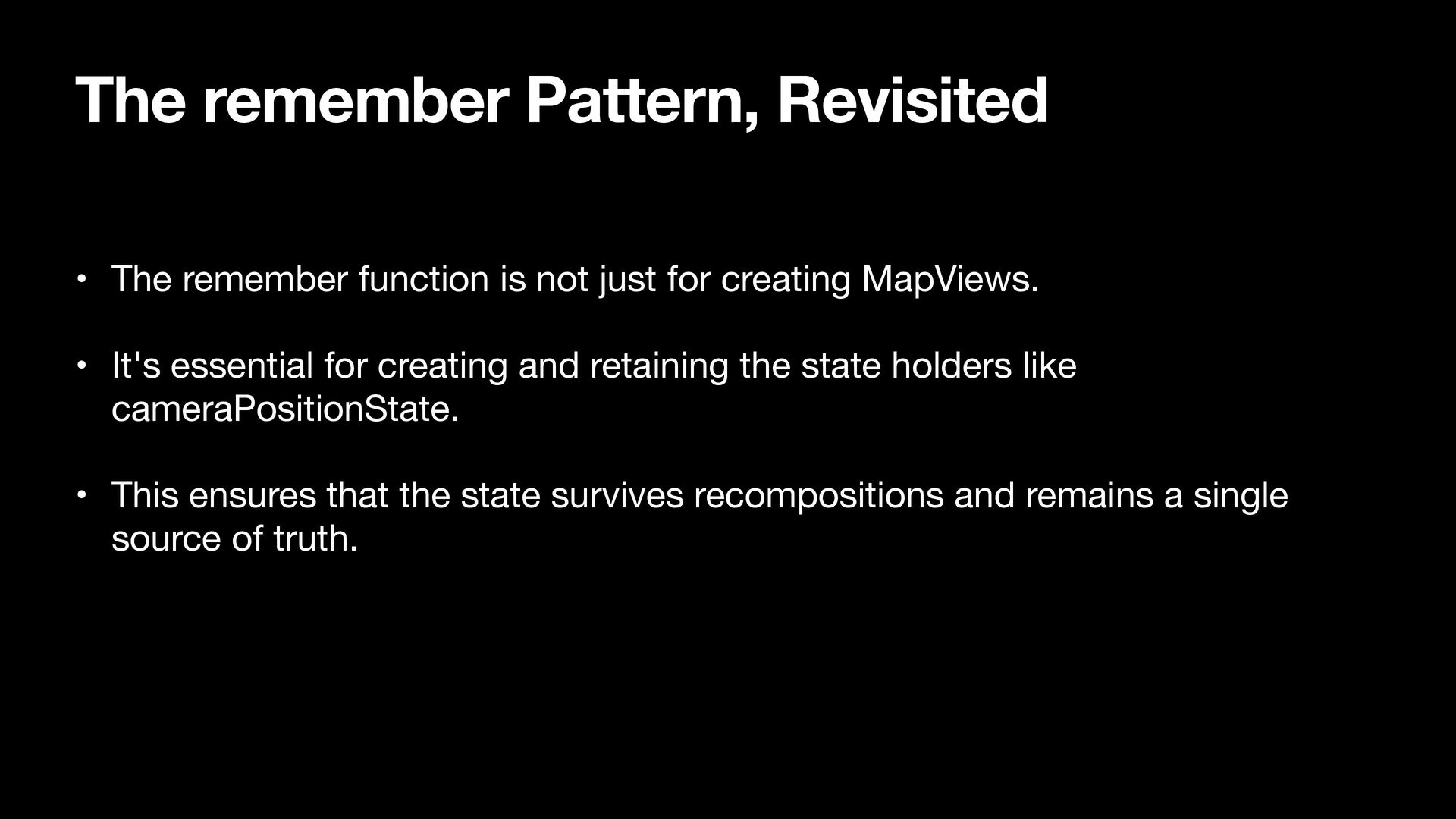 just for creating MapViews. • It's essential for creating and retaining the state holders like cameraPositionState. • This ensures that the state survives recompositions and remains a single source of truth.