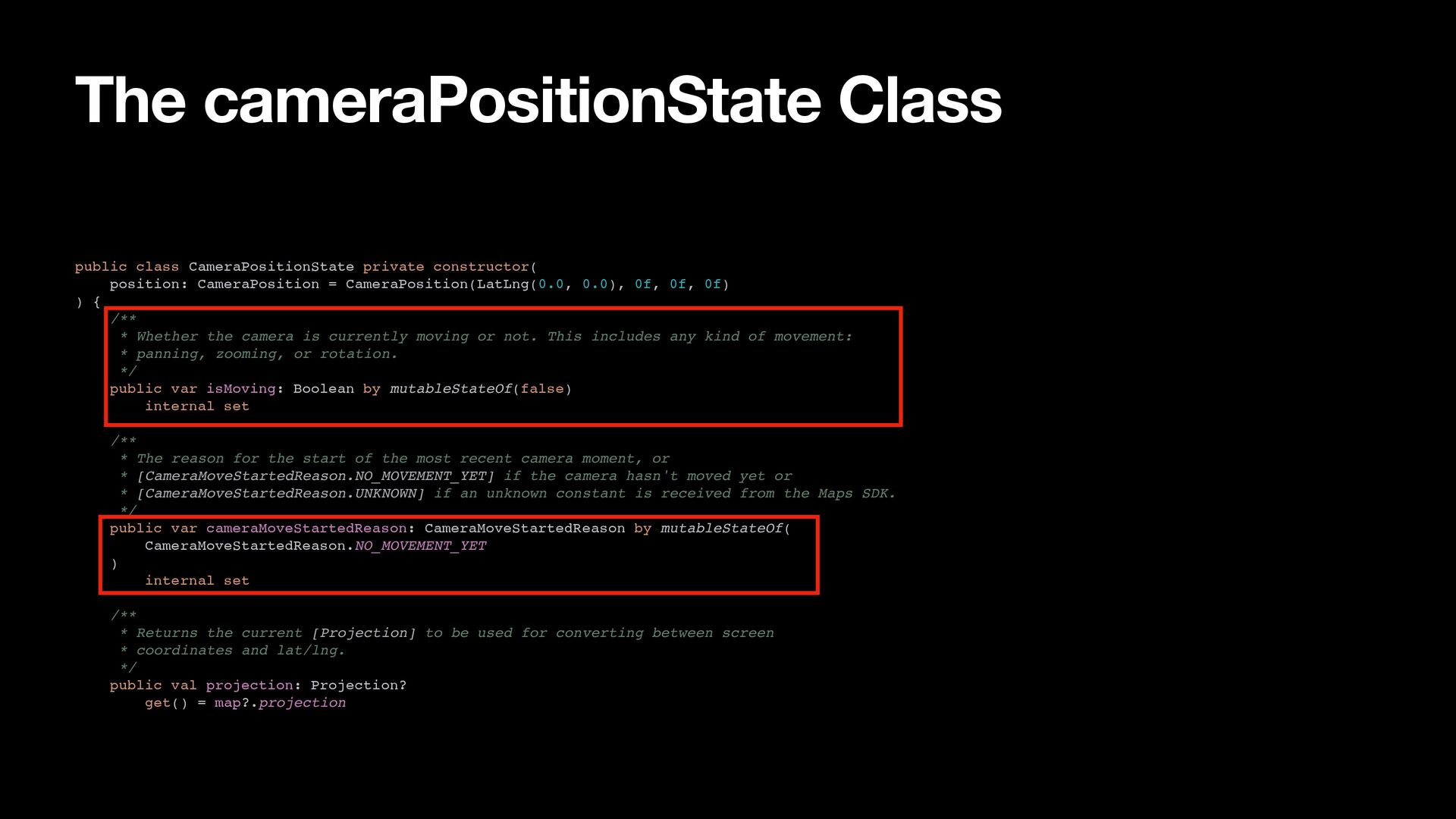 = CameraPosition(LatLng(0.0, 0.0), 0f, 0f, 0f) ) { /** * Whether the camera is currently moving or not. This includes any kind of movement: * panning, zooming, or rotation. */ public var isMoving: Boolean by mutableStateOf(false) internal set /** * The reason for the start of the most recent camera moment, or * [CameraMoveStartedReason.NO_MOVEMENT_YET] if the camera hasn't moved yet or * [CameraMoveStartedReason.UNKNOWN] if an unknown constant is received from the Maps SDK. */ public var cameraMoveStartedReason: CameraMoveStartedReason by mutableStateOf( CameraMoveStartedReason.NO_MOVEMENT_YET ) internal set /** * Returns the current [Projection] to be used for converting between screen * coordinates and lat/lng. */ public val projection: Projection? get() = map?.projection