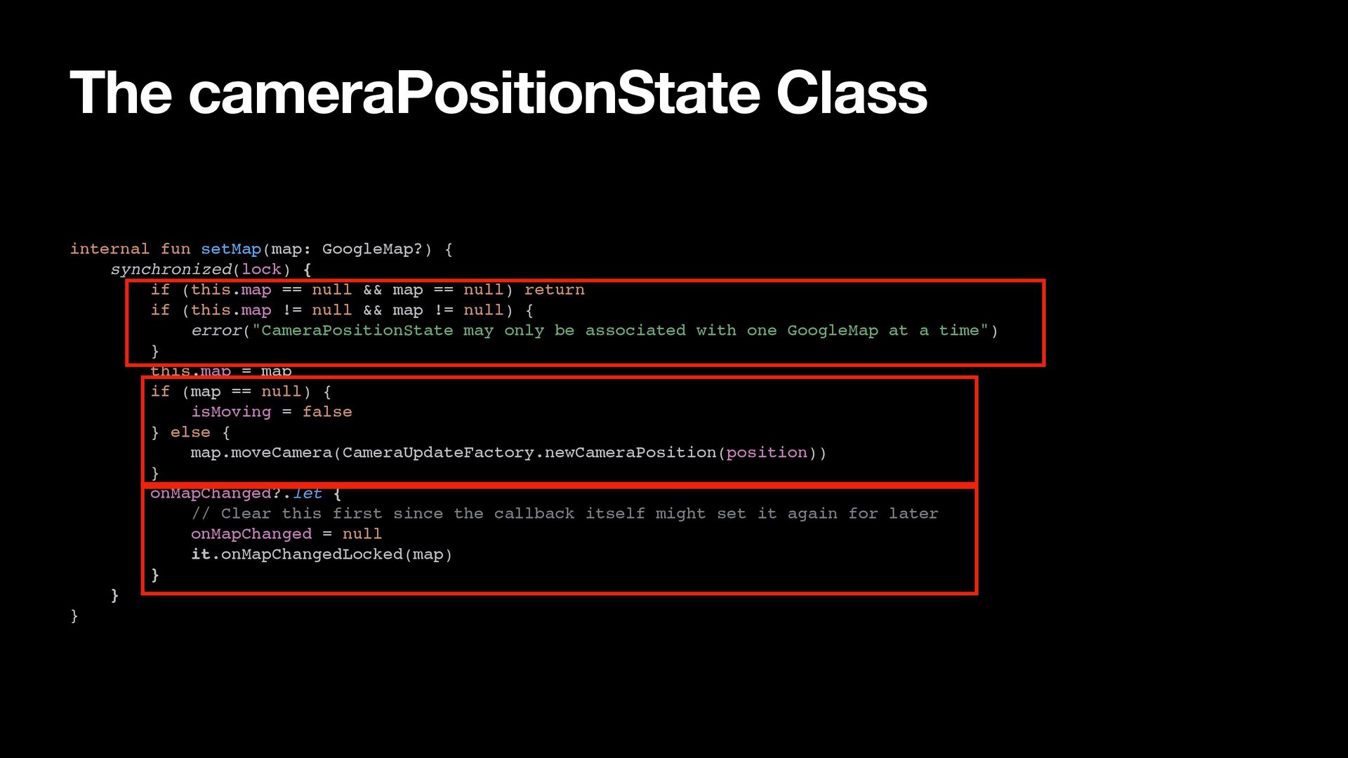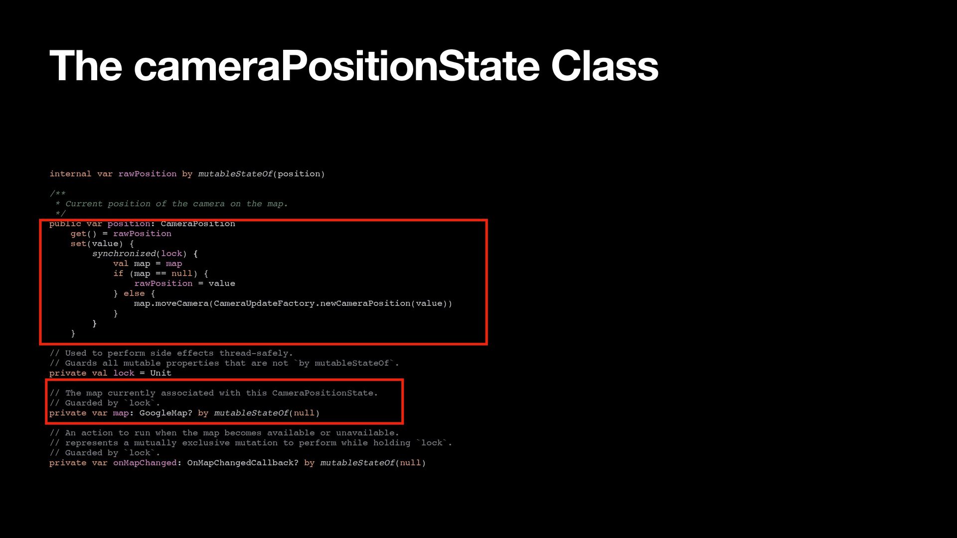 Current position of the camera on the map. */ public var position: CameraPosition get() = rawPosition set(value) { synchronized(lock) { val map = map if (map == null) { rawPosition = value } else { map.moveCamera(CameraUpdateFactory.newCameraPosition(value)) } } } // Used to perform side effects thread-safely. // Guards all mutable properties that are not `by mutableStateOf`. private val lock = Unit // The map currently associated with this CameraPositionState. // Guarded by `lock`. private var map: GoogleMap? by mutableStateOf(null) // An action to run when the map becomes available or unavailable. // represents a mutually exclusive mutation to perform while holding `lock`. // Guarded by `lock`. private var onMapChanged: OnMapChangedCallback? by mutableStateOf(null)