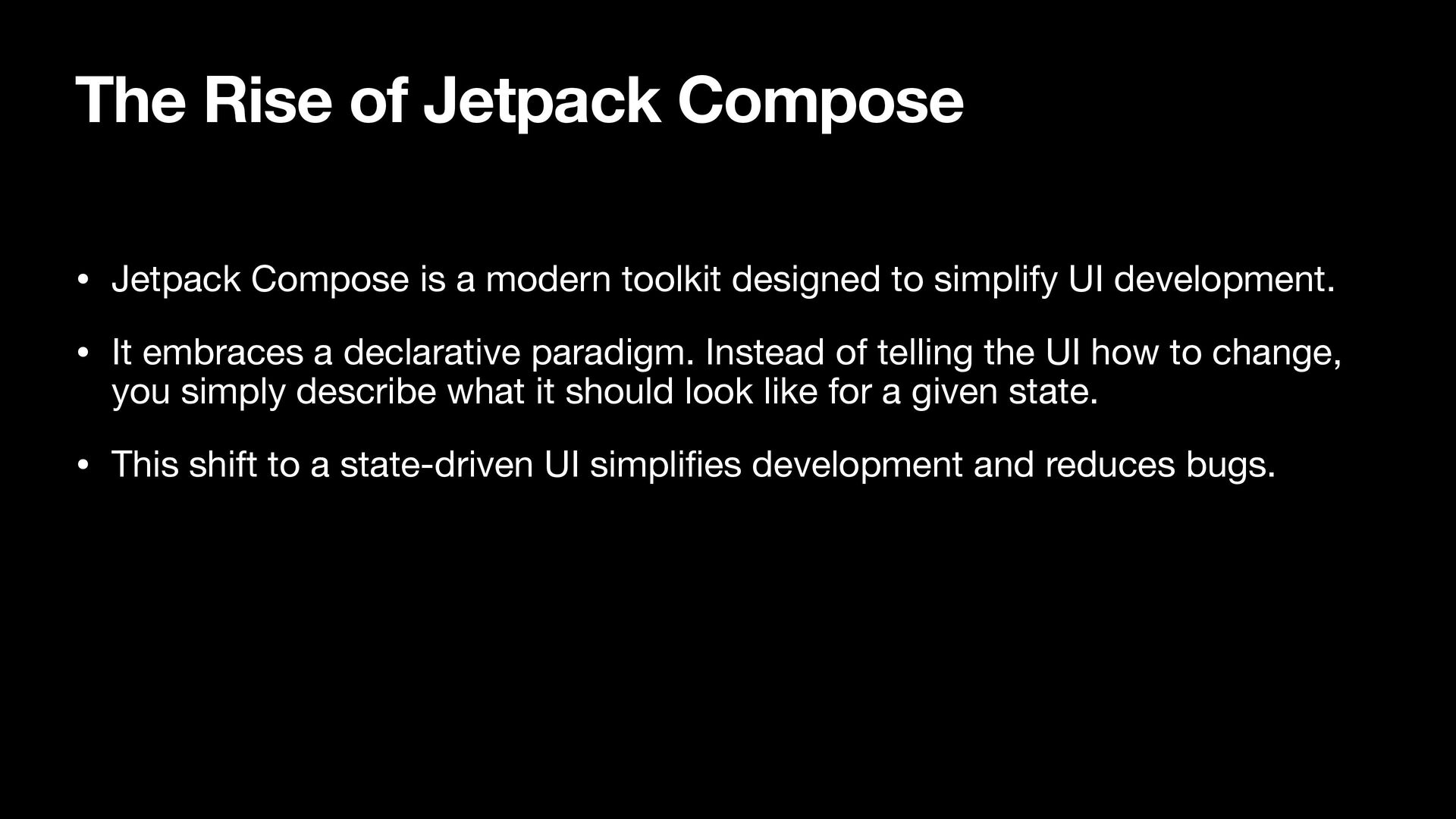 modern toolkit designed to simplify UI development. • It embraces a declarative paradigm. Instead of telling the UI how to change, you simply describe what it should look like for a given state. • This shift to a state-driven UI simpli fi es development and reduces bugs.