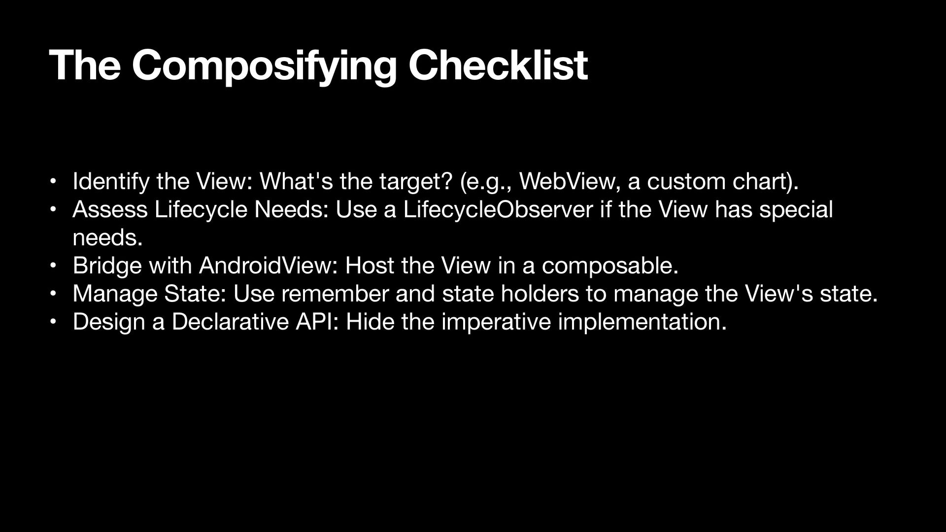 (e.g., WebView, a custom chart). • Assess Lifecycle Needs: Use a LifecycleObserver if the View has special needs. • Bridge with AndroidView: Host the View in a composable. • Manage State: Use remember and state holders to manage the View's state. • Design a Declarative API: Hide the imperative implementation.