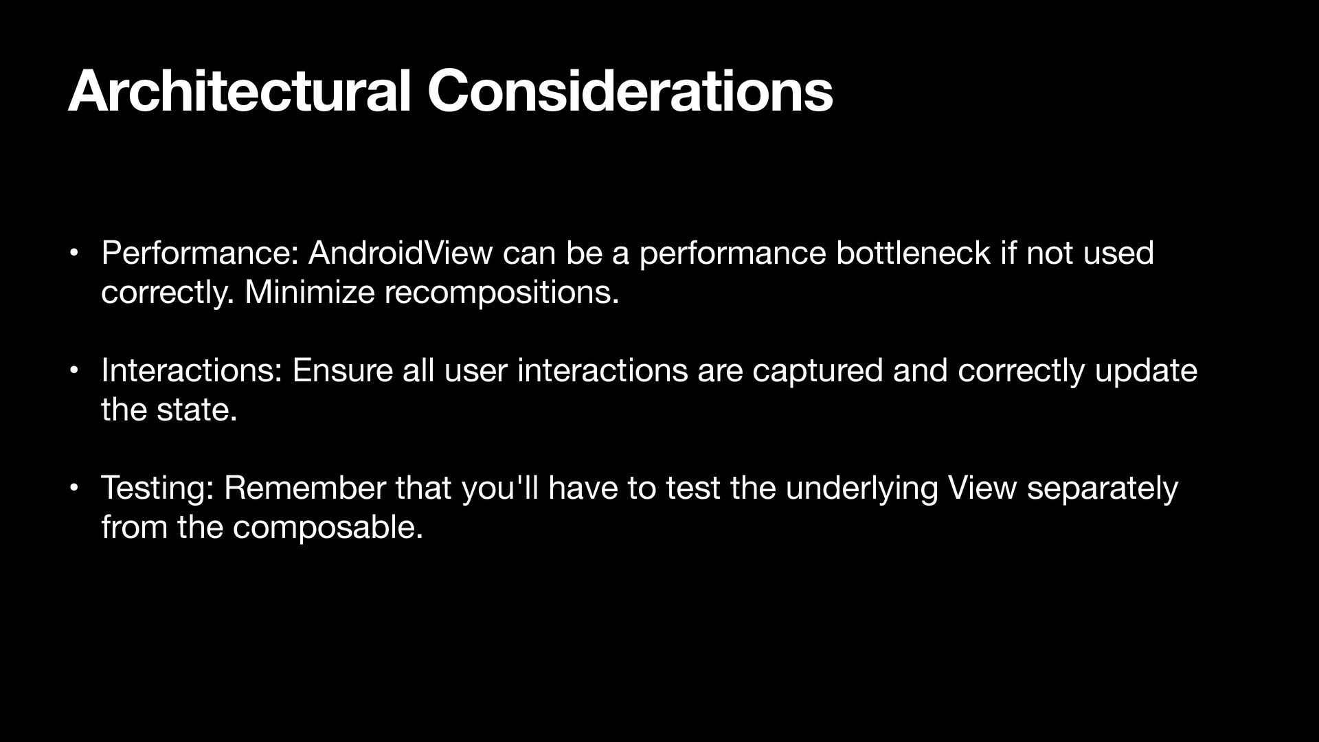 if not used correctly. Minimize recompositions. • Interactions: Ensure all user interactions are captured and correctly update the state. • Testing: Remember that you'll have to test the underlying View separately from the composable.
