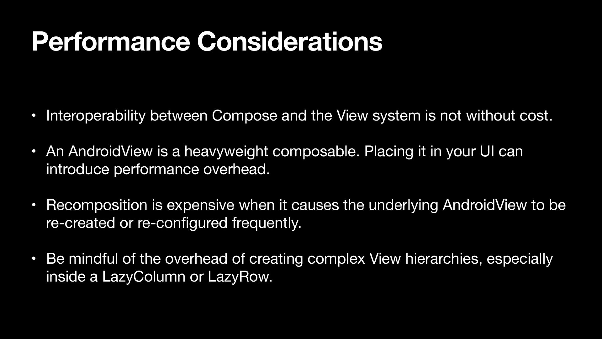 is not without cost. • An AndroidView is a heavyweight composable. Placing it in your UI can introduce performance overhead. • Recomposition is expensive when it causes the underlying AndroidView to be re-created or re-con fi gured frequently. • Be mindful of the overhead of creating complex View hierarchies, especially inside a LazyColumn or LazyRow.