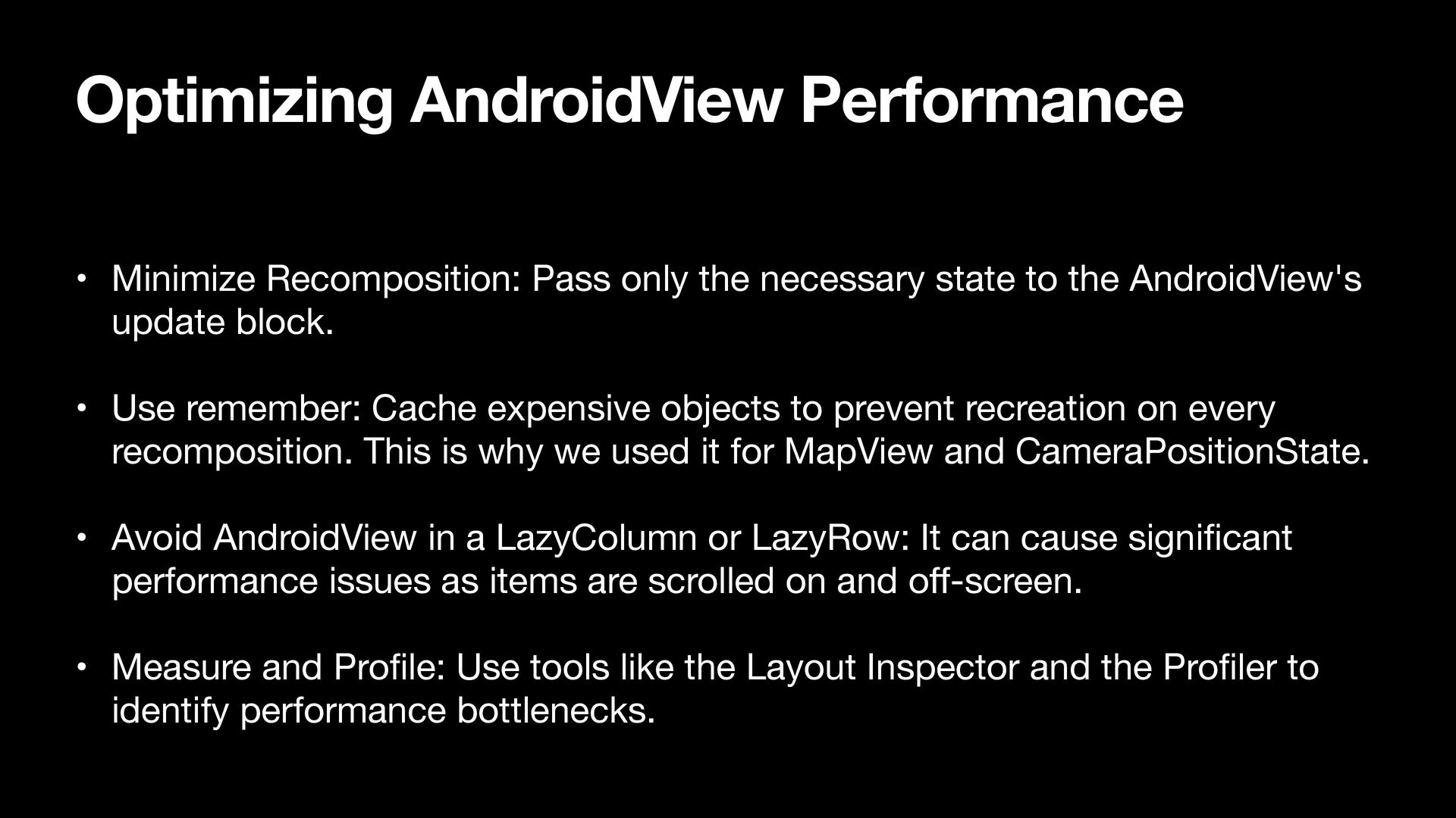 state to the AndroidView's update block. • Use remember: Cache expensive objects to prevent recreation on every recomposition. This is why we used it for MapView and CameraPositionState. • Avoid AndroidView in a LazyColumn or LazyRow: It can cause signi fi cant performance issues as items are scrolled on and o ff -screen. • Measure and Pro fi le: Use tools like the Layout Inspector and the Pro fi ler to identify performance bottlenecks.