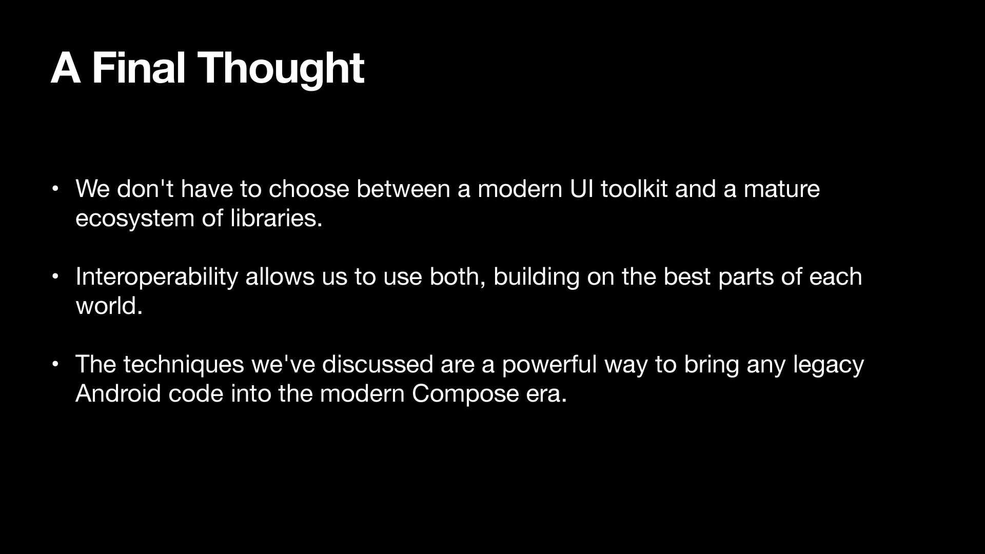 a modern UI toolkit and a mature ecosystem of libraries. • Interoperability allows us to use both, building on the best parts of each world. • The techniques we've discussed are a powerful way to bring any legacy Android code into the modern Compose era.