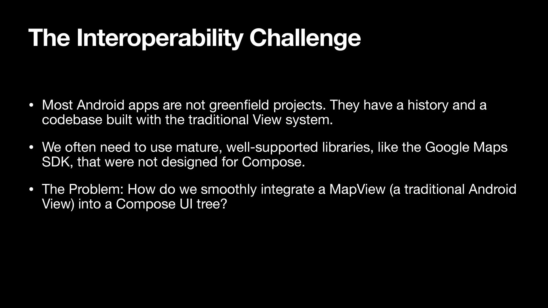 fi eld projects. They have a history and a codebase built with the traditional View system. • We often need to use mature, well-supported libraries, like the Google Maps SDK, that were not designed for Compose. • The Problem: How do we smoothly integrate a MapView (a traditional Android View) into a Compose UI tree?