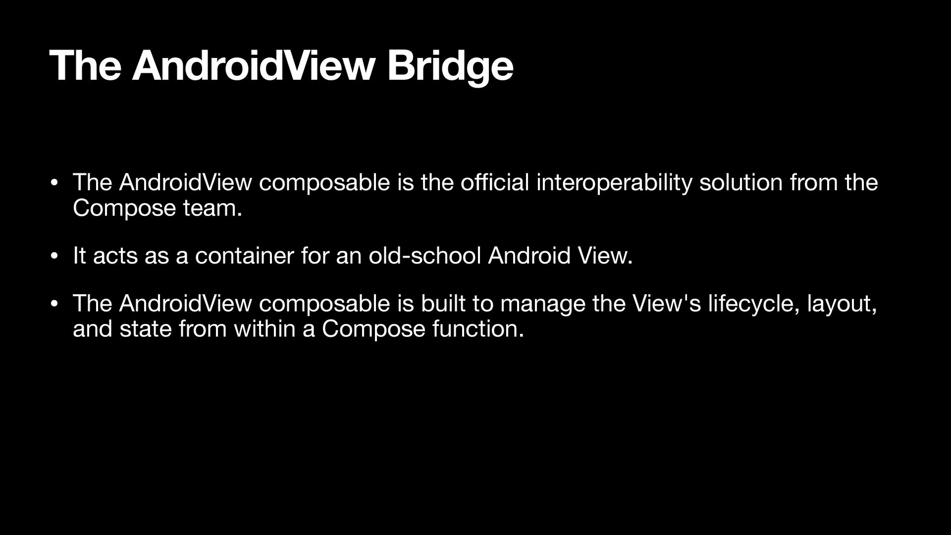 ffi cial interoperability solution from the Compose team. • It acts as a container for an old-school Android View. • The AndroidView composable is built to manage the View's lifecycle, layout, and state from within a Compose function.