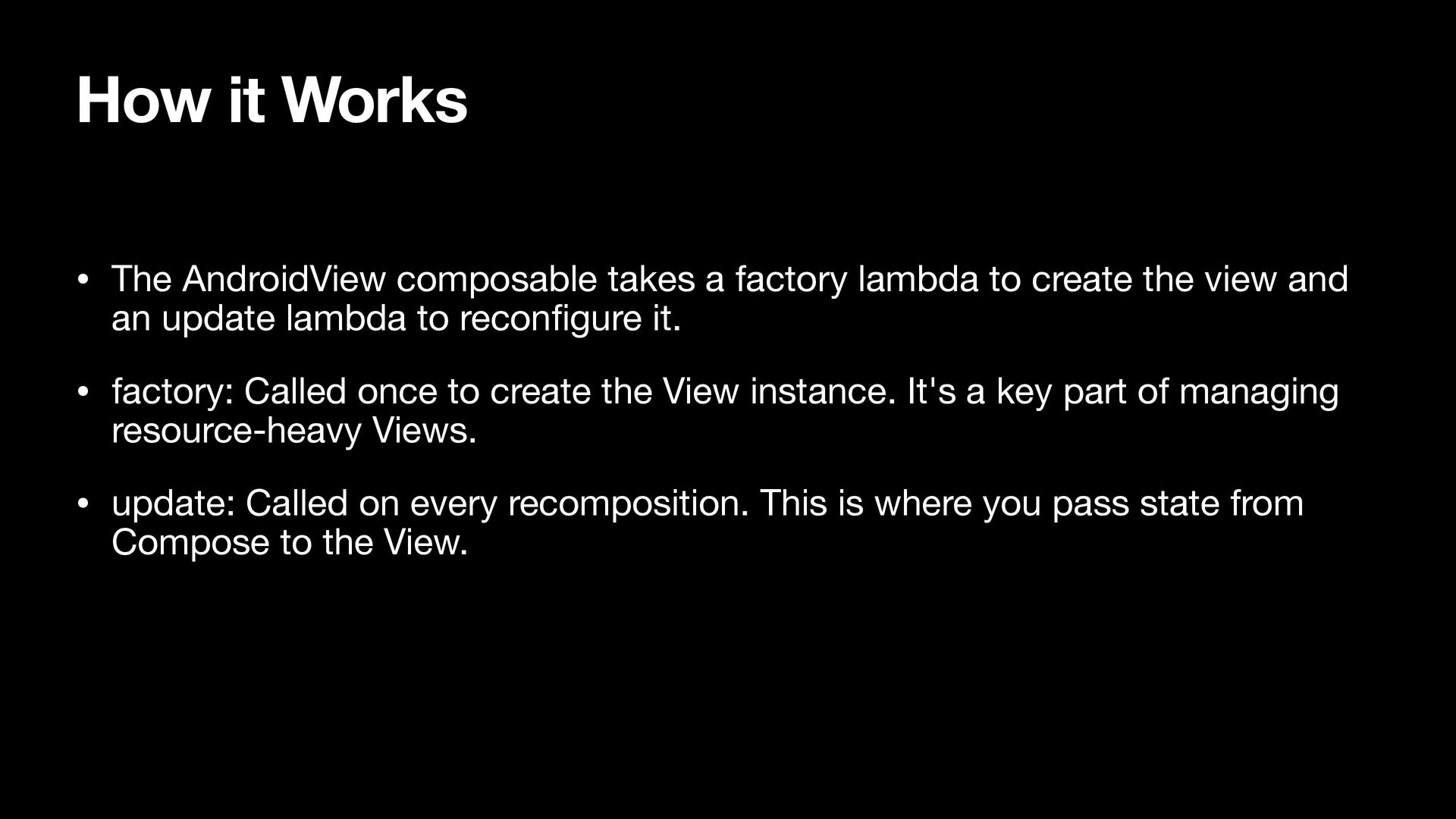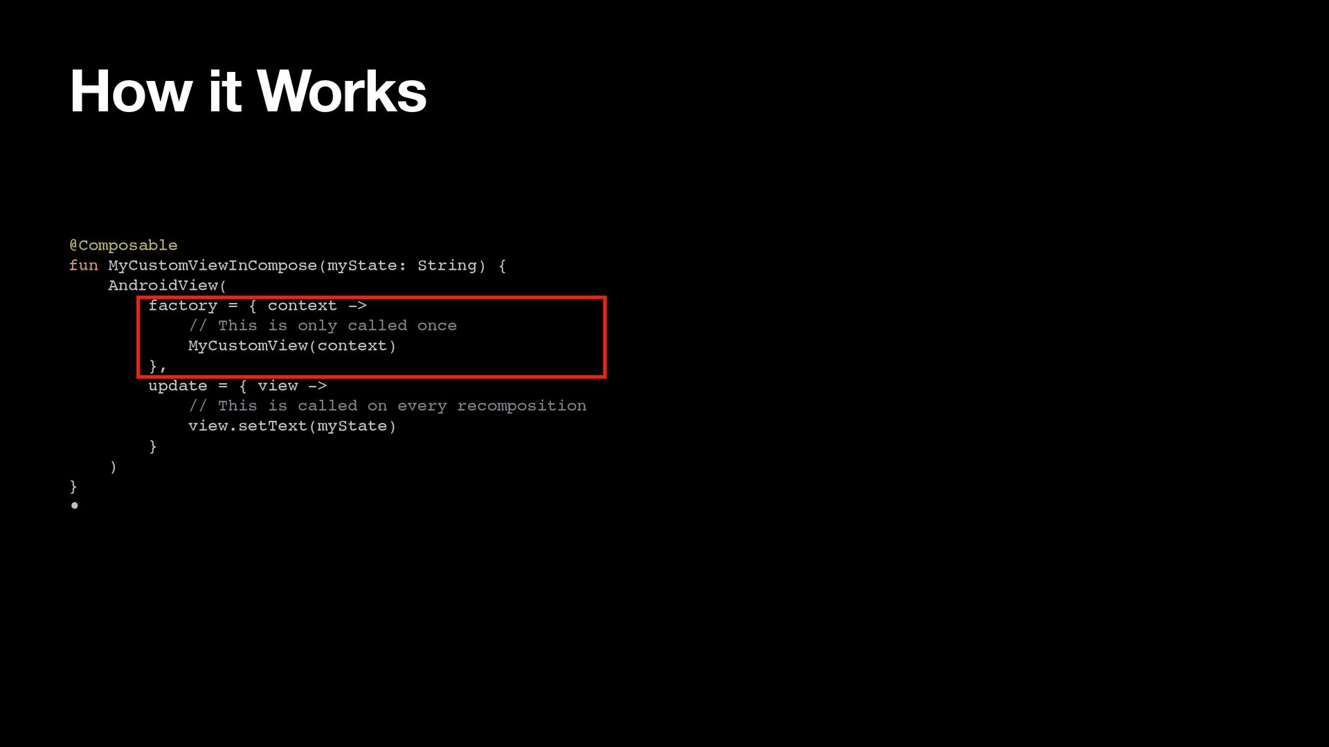 lambda to create the view and an update lambda to recon fi gure it. • factory: Called once to create the View instance. It's a key part of managing resource-heavy Views. • update: Called on every recomposition. This is where you pass state from Compose to the View.