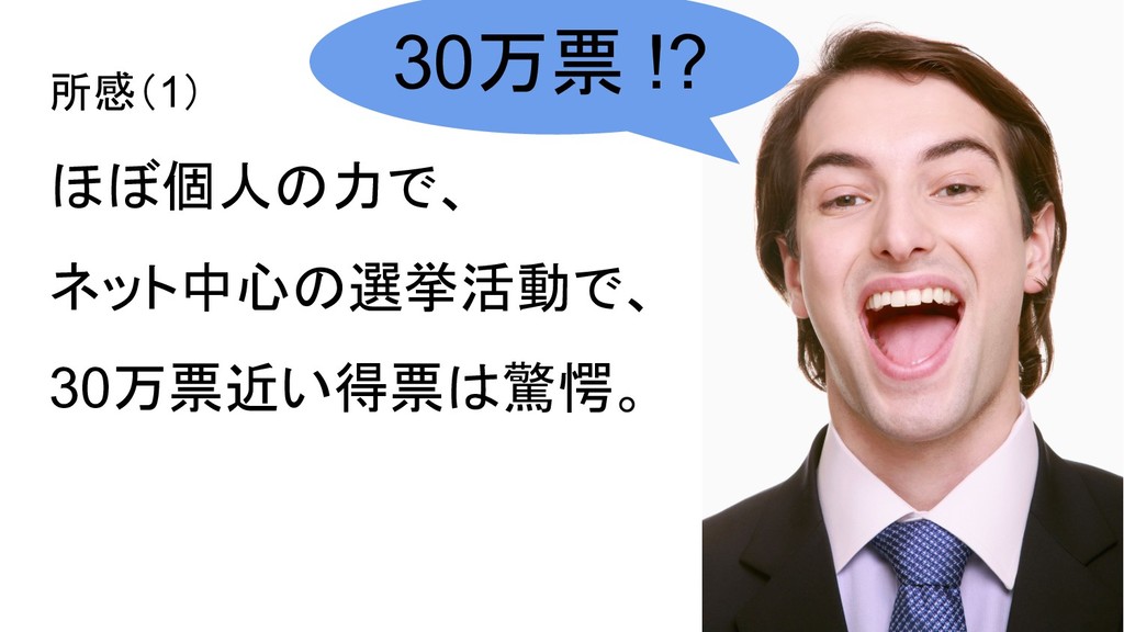 所感(1) ほぼ個人の力で、 ネット中心の選挙活動で、 30万票近い得票は驚愕。 30万票 !?